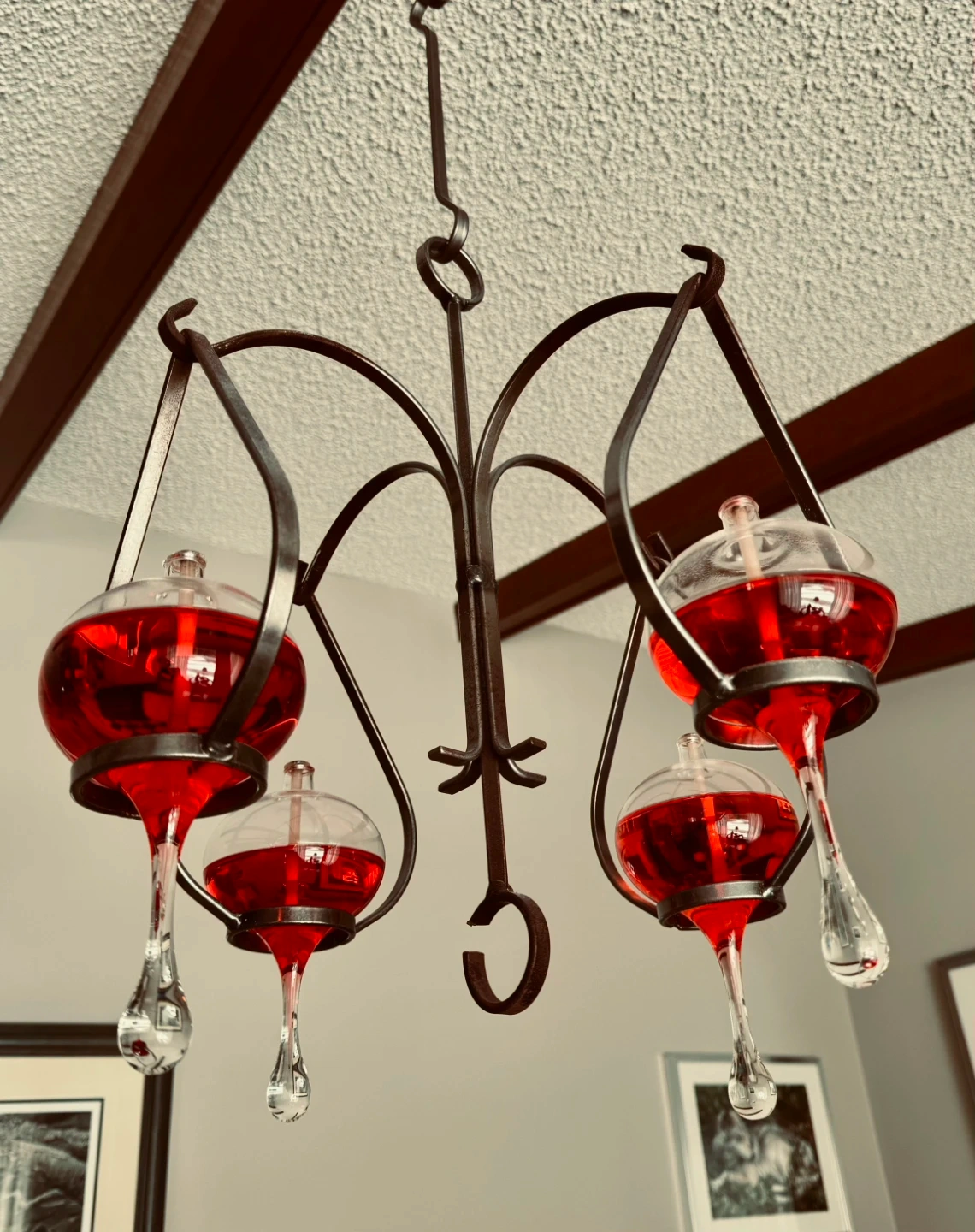 This unique chandelier features four glass globes filled with red liquid and decorative glass droplets. The metal frame has an antique dark finish. It's a striking piece that adds a pop of colour and vintage charm to any room.
