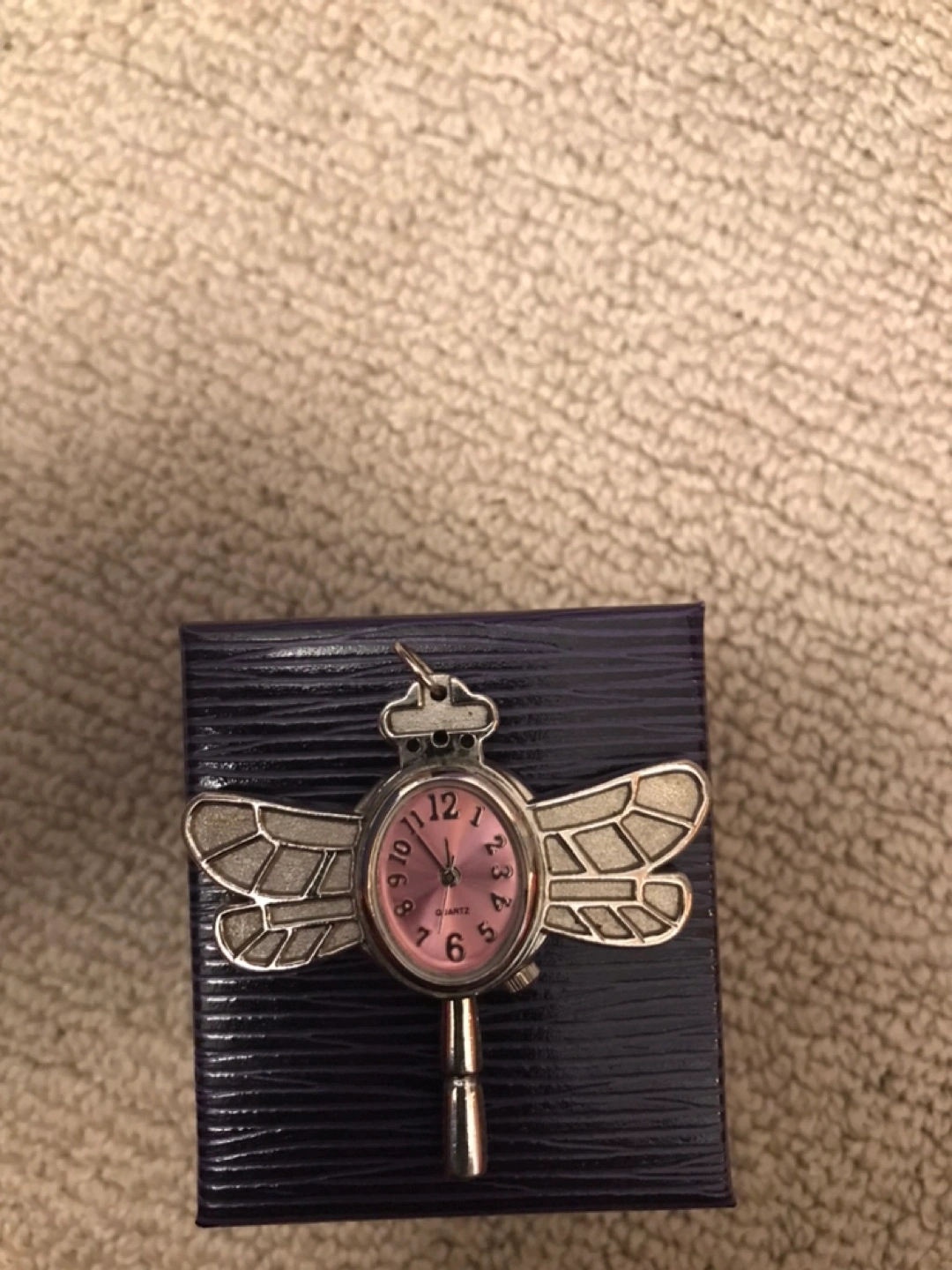 Here's a unique dragonfly pendant necklace watch! in great condition. The watch face has a pink background with numbers, and the dragonfly design is really eye-catching . Works fine
