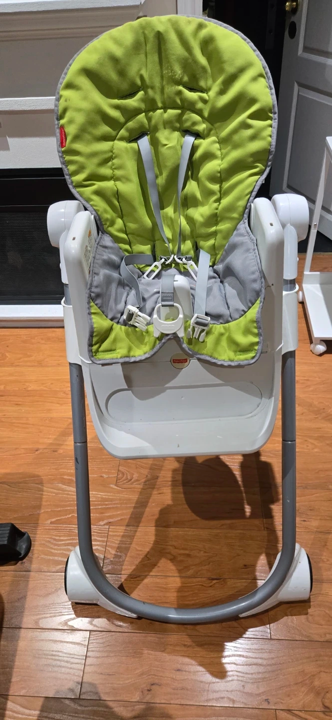 Fisher-Price high chair with a green and grey padded seat. Features a removable tray and a 5-point harness system. Easy to wipe down and clean. Seat height can also be adjusted.