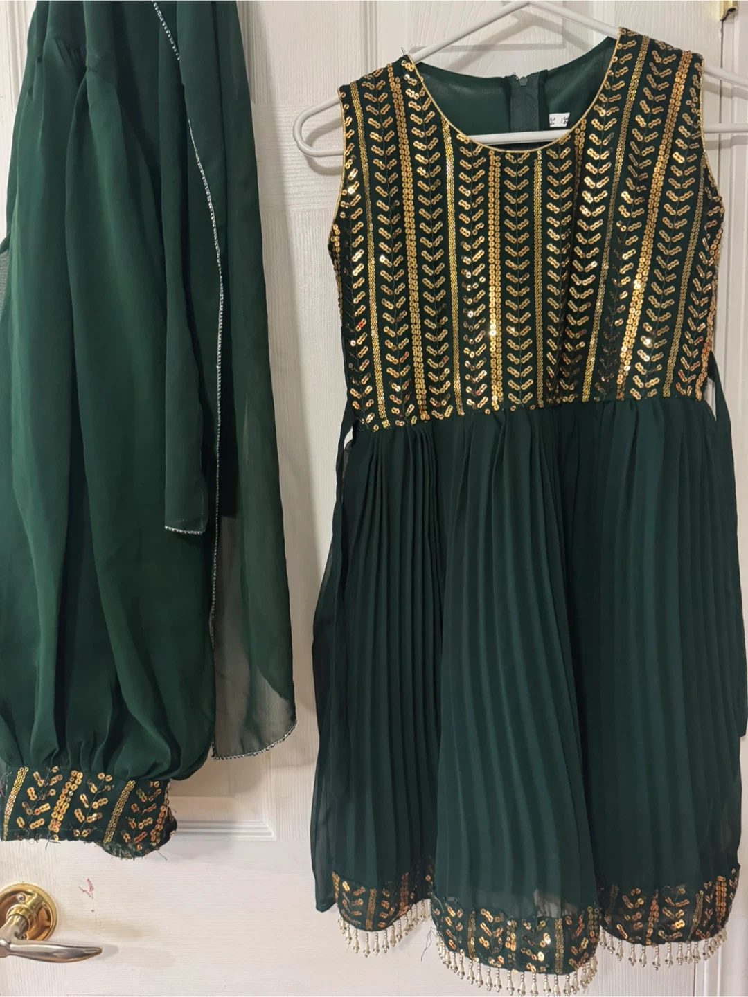A beautiful sleeveless dress featuring a sequined bodice and a pleated skirt in a rich emerald green hue. It comes with a matching dupatta. Kids Size 34