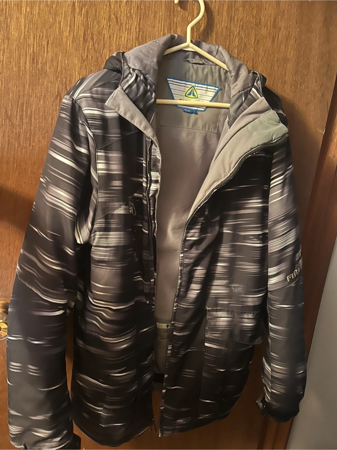This Firefly ski jacket features a black, grey, and white abstract pattern. It includes a full zip front and multiple pockets. Suitable for cold weather activities. Size youth small