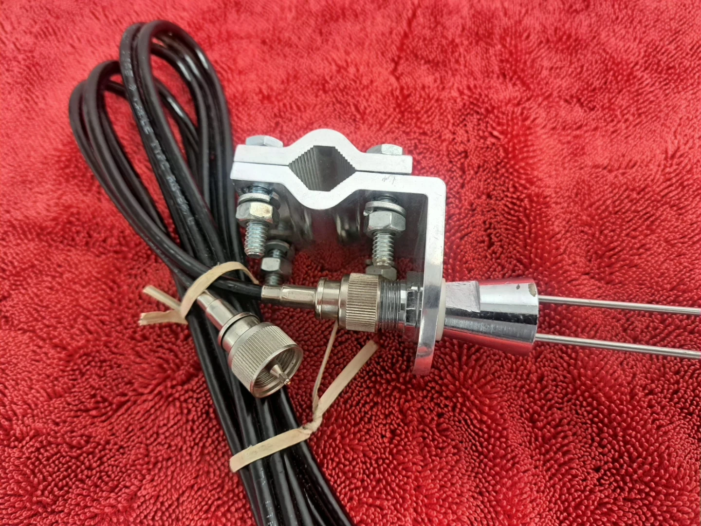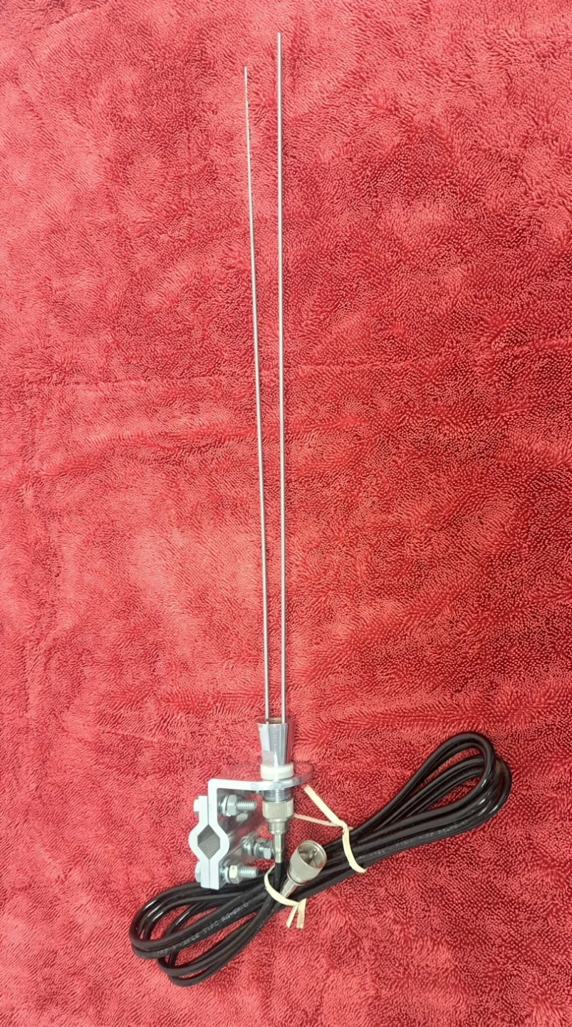This is a CB radio antenna with a clamp-on mount and a coaxial cable. It features two stainless steel whips and a 1/2 thread for extension. Useful for mobile or base station communication.