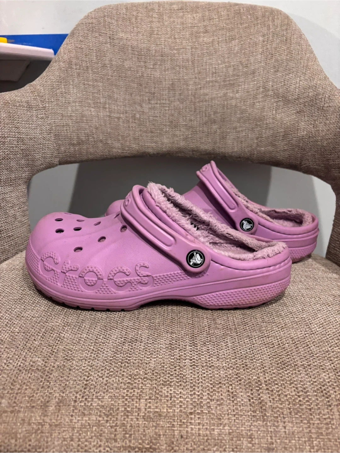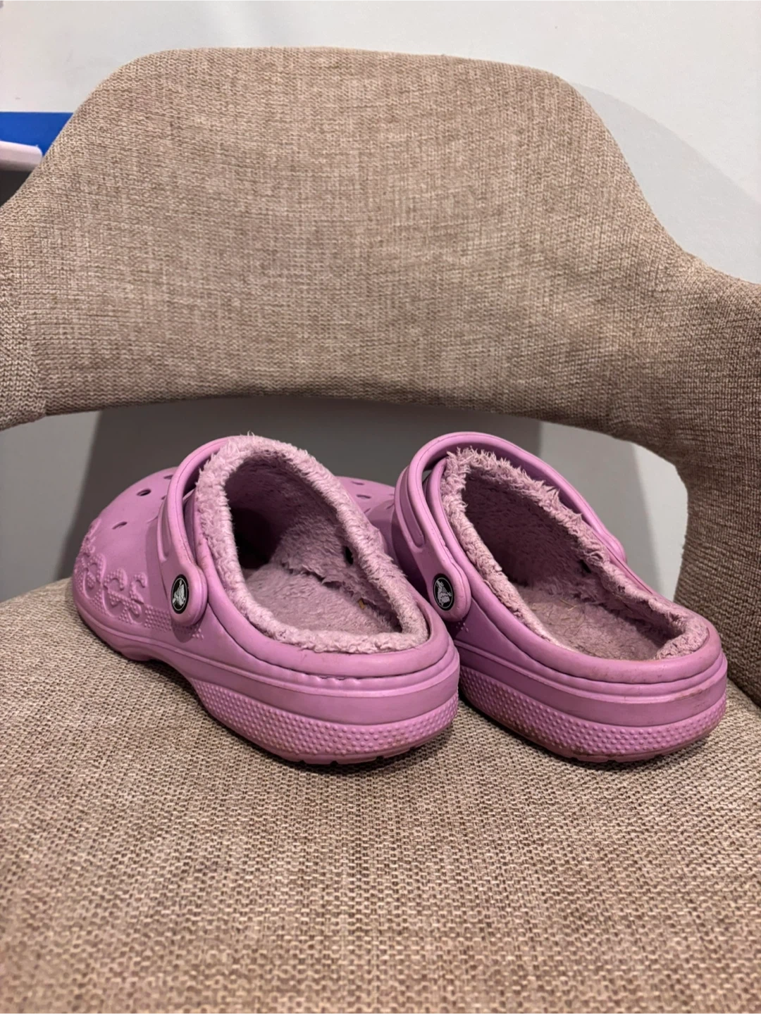 These purple Crocs feature a cozy fleece lining for extra warmth. They are a size 9. Perfect for keeping your feet toasty on cooler days!