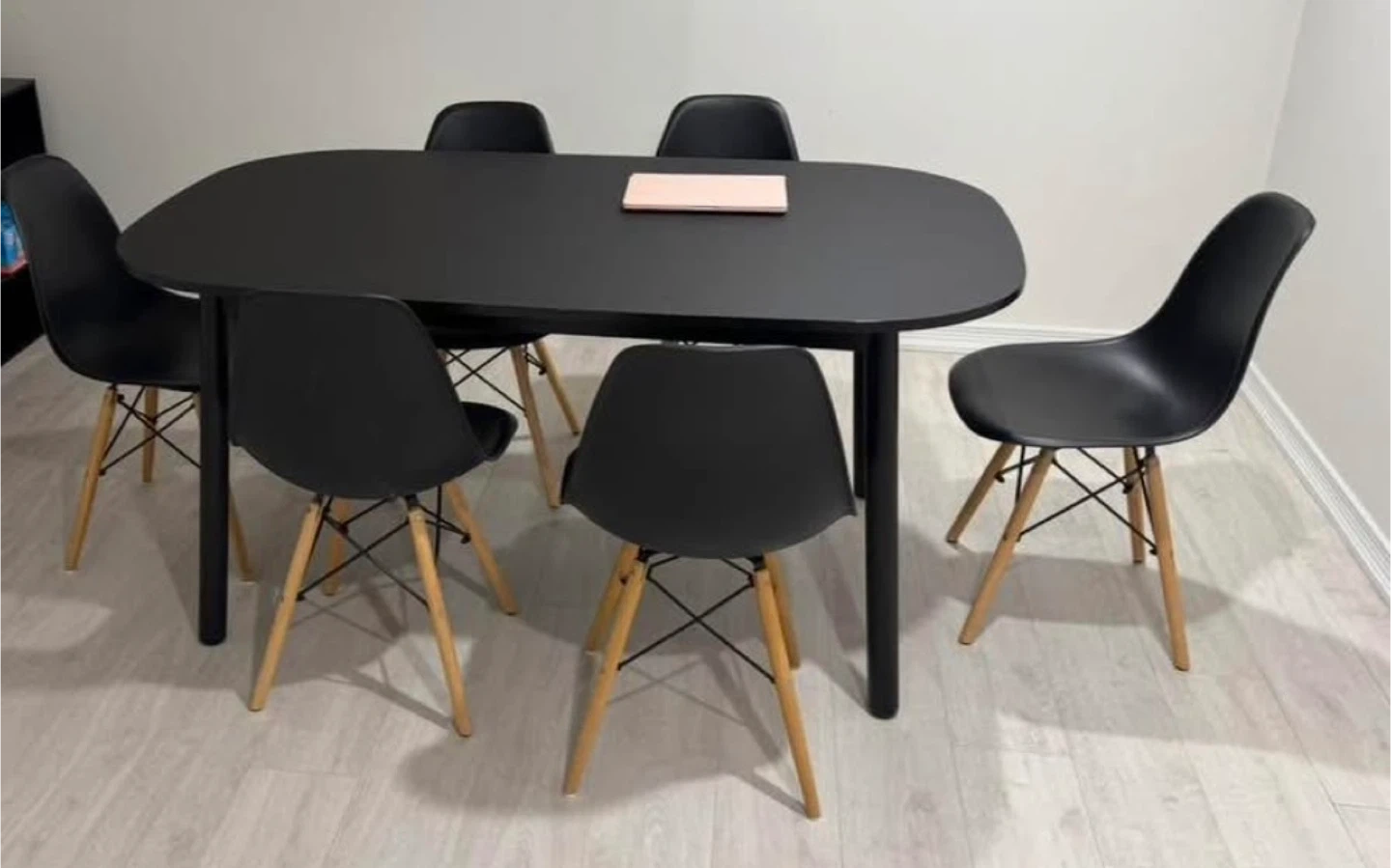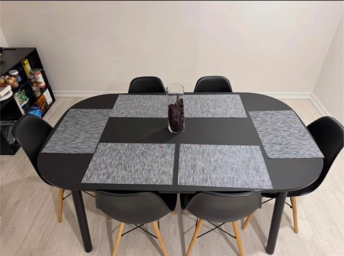 Selling an Ikea Vedbo dining table with six black chairs. The table comfortably seats six people and is in great condition. The table dimensions are 160cm x 95cm (63" x 37 3/8")