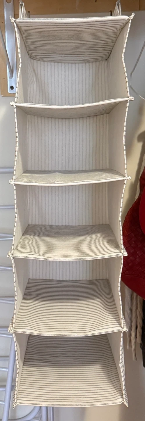 This hanging closet organizer has multiple shelves. It's made of fabric with a striped pattern. It hangs from a closet rod for easy storage!