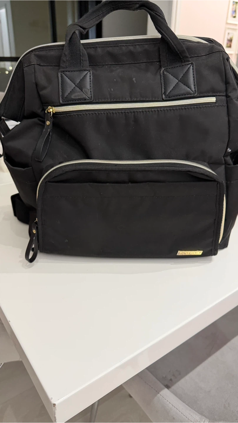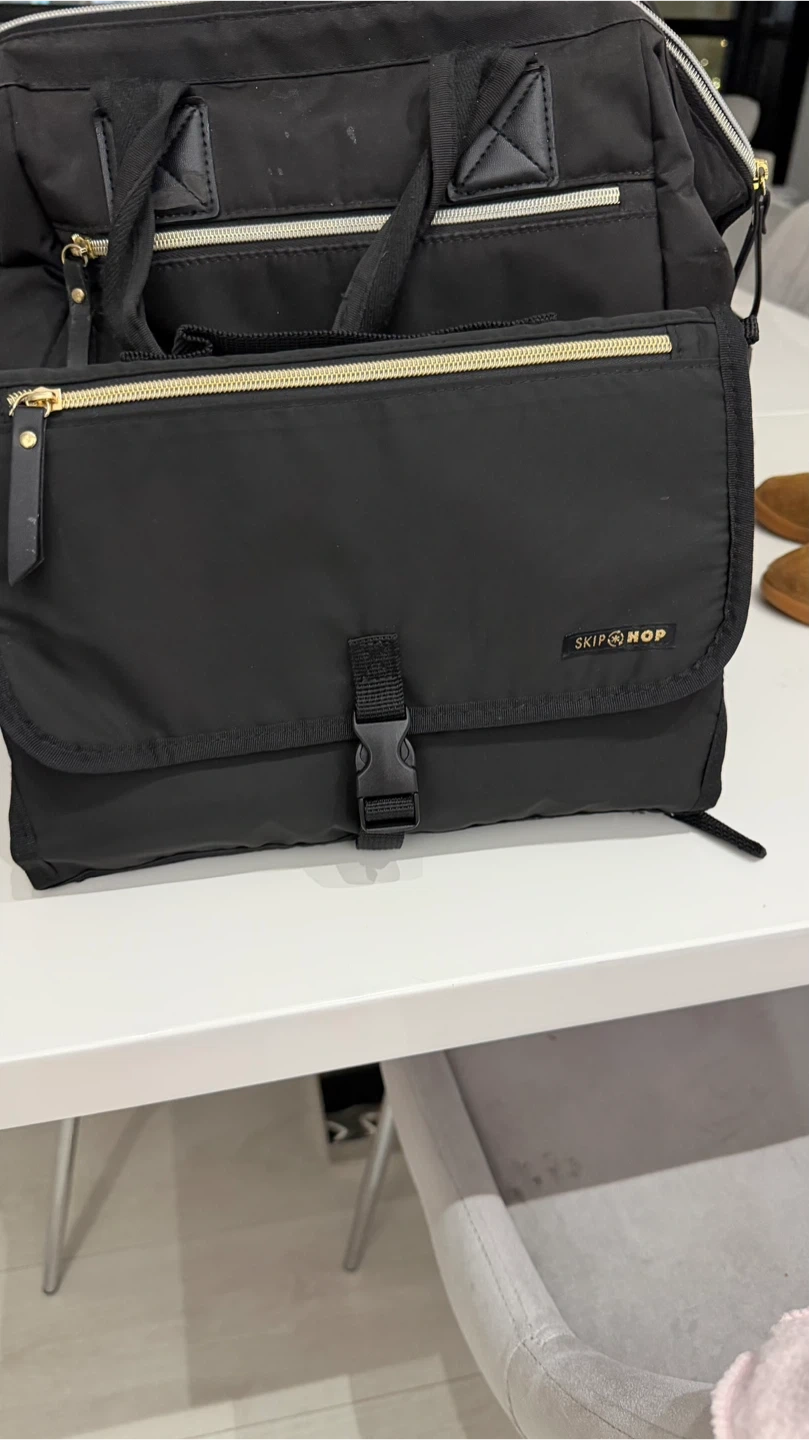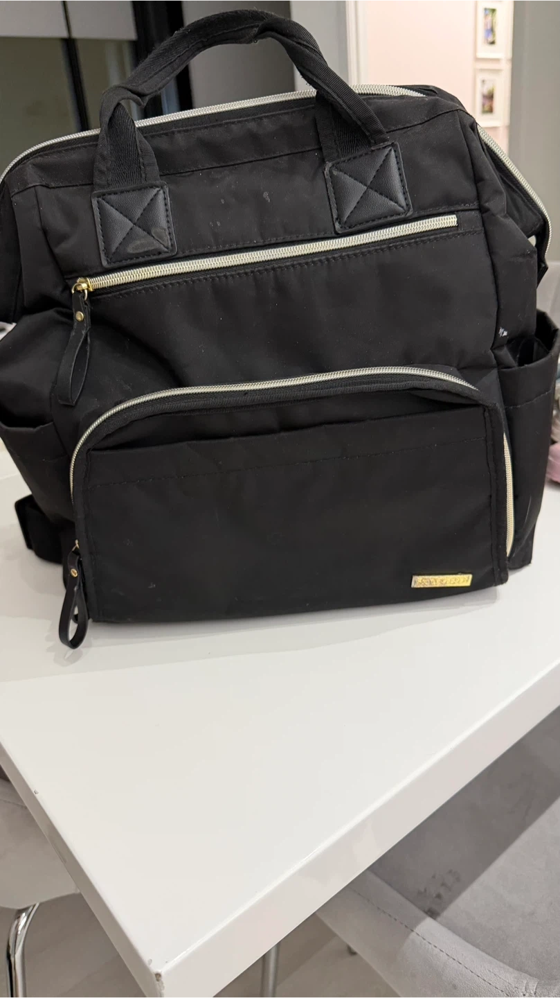 Black Skip Hop diaper bag backpack with multiple pockets. Features a front flap pocket with a buckle closure. Durable nylon material.