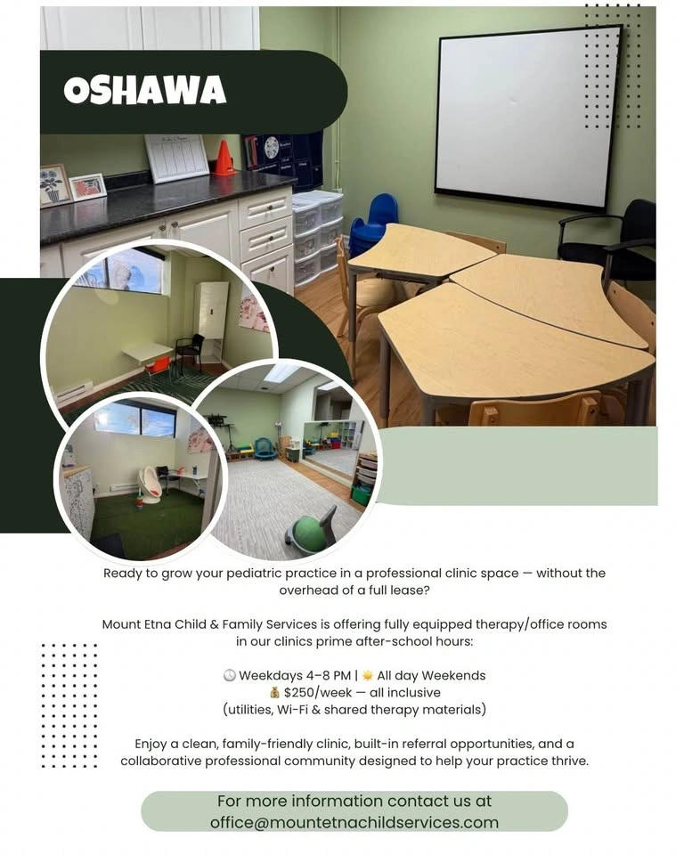 Looking for a professional space to grow your practice without committing to a full lease? Mount Etna Child & Family Services is reintroducing our fully equipped clinic rooms in central Durham & Toronto — perfect for SLPs, OTs, tutors, music teachers, and allied professionals. $250/week – ALL INCLUSIVE (utilities, Wi-Fi & shared therapy materials). Prime after-school hours: 4–8 PM weekdays + all day Sunday. Built-in referral opportunities, caseload share & collaborative environment. Comfortable parent lounge in every clinic. Clean, child-friendly, professional setting. Open and flexible to schedule and negotiations. Feel free to message if you have any questions!