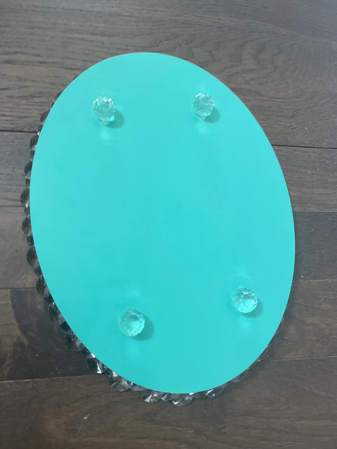This is an oval vanity tray with a mirrored surface. Its measurements are 34 cm in width and 42 cm in length. It's decorated with clear acrylic beads and pearl accents around the edge. The tray has four clear crystal-like feet for stability.pet and smoke free 🏡 new never used