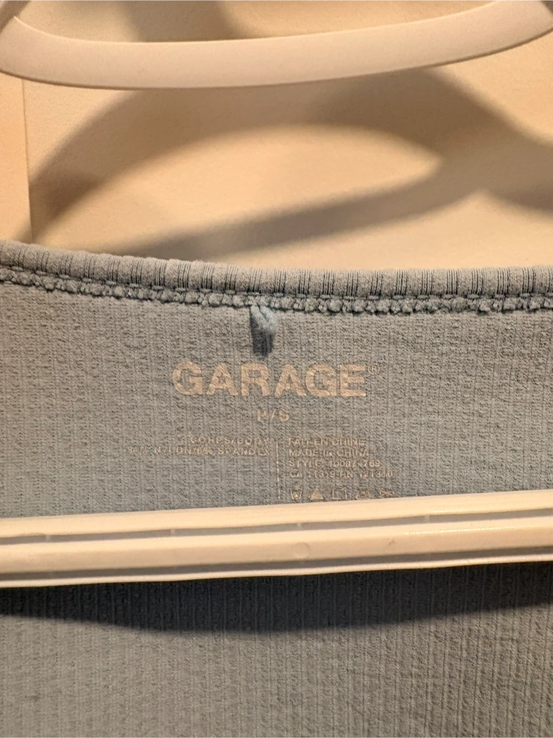 This light blue ribbed long sleeve crop top is from Garage. It has a scoop neck and lettuce hem. Fabric content is 95% rayon and 5% spandex. Cash only.