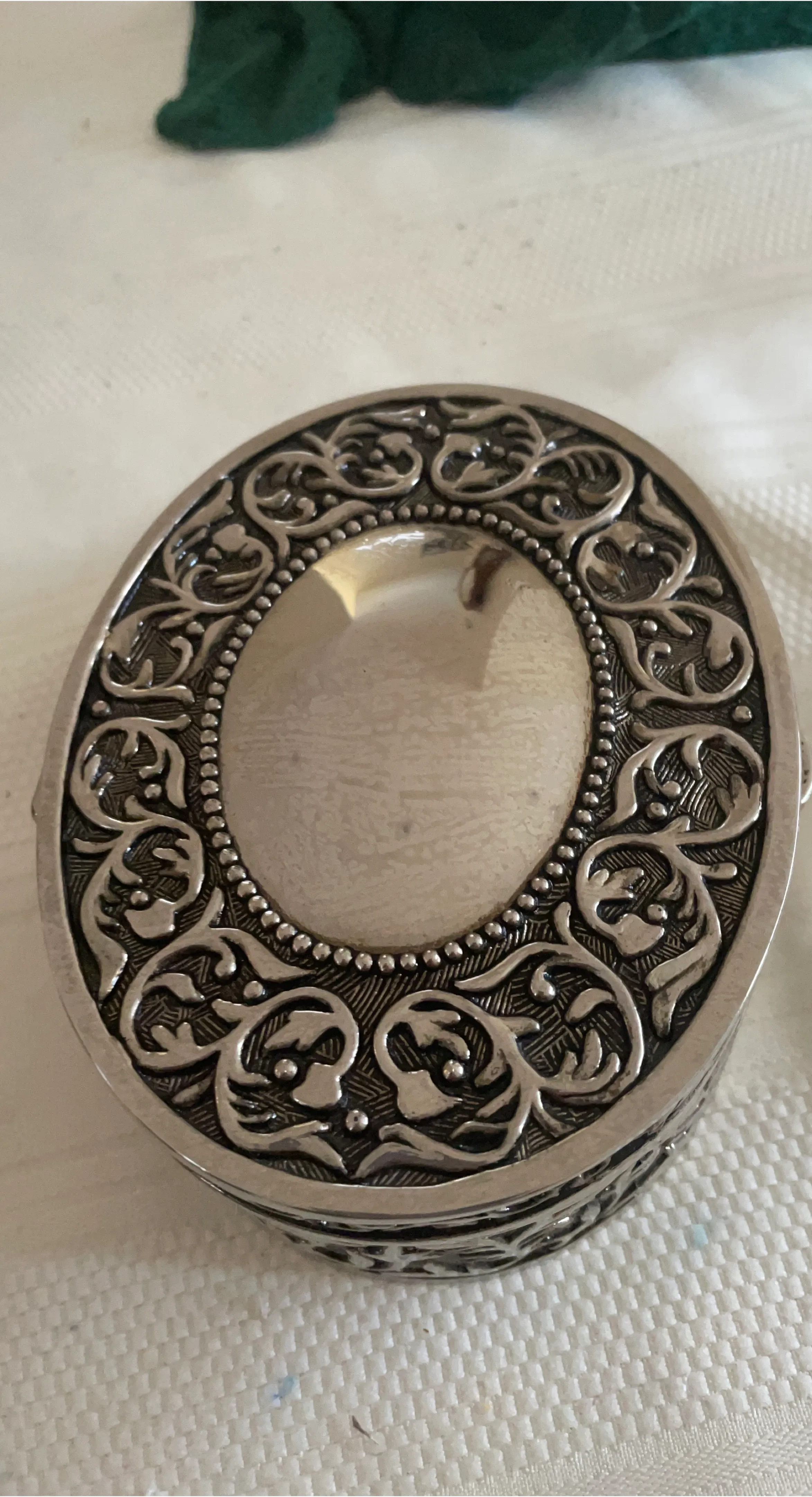 Decorative oval trinket box with an ornate, vintage-inspired design. This piece is silver-toned and features intricate scrollwork and beaded detailing. It's ideal for storing small jewellery or keepsakes. Metal construction. Silver plated