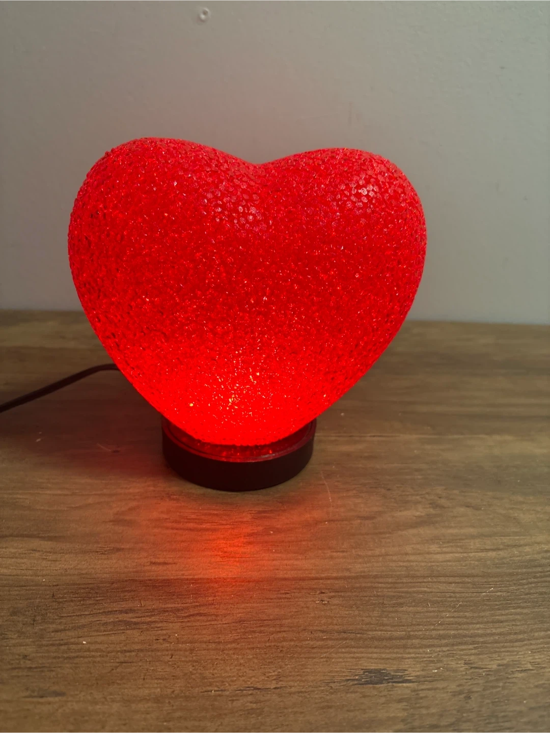 This is a fun red heart-shaped lamp. It's made of a textured plastic material and illuminates with a warm red glow. It's powered by a cord with an inline switch.