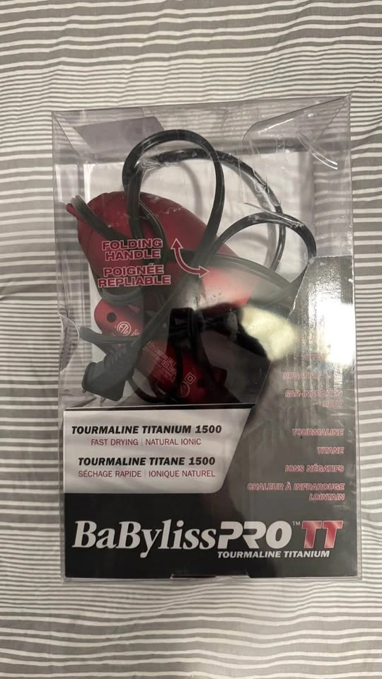 New, open box BaBylissPRO TT Tourmaline Titanium 1500 hairdryer. Red color. Has a folding handle, fast drying, natural ionic. Good for travel or home.
