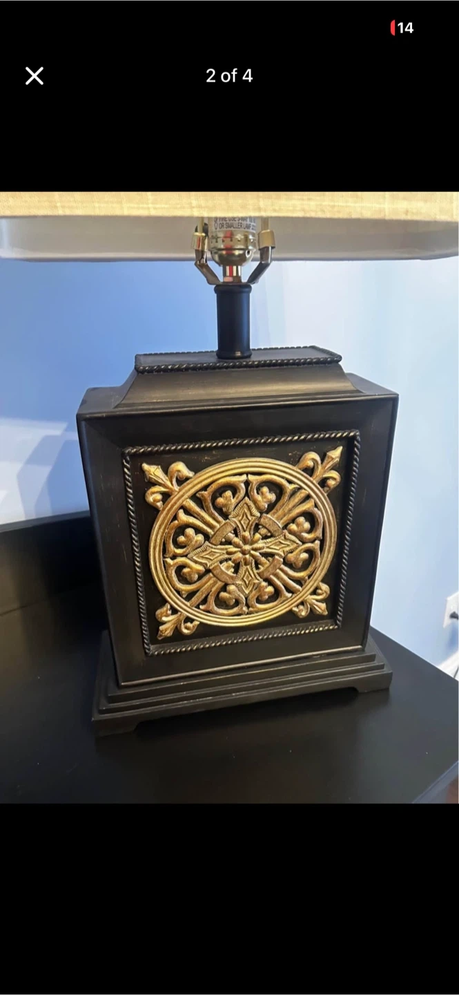 Decorative table lamp with a square base and a linen-style shade. The base features an ornate gold-tone medallion. It's approximately 27 inches tall. Adds a touch of classic style to any room.