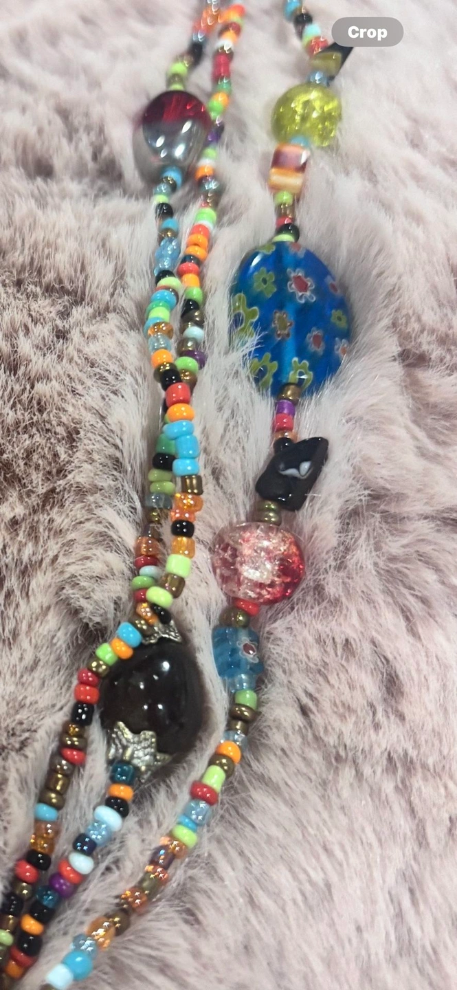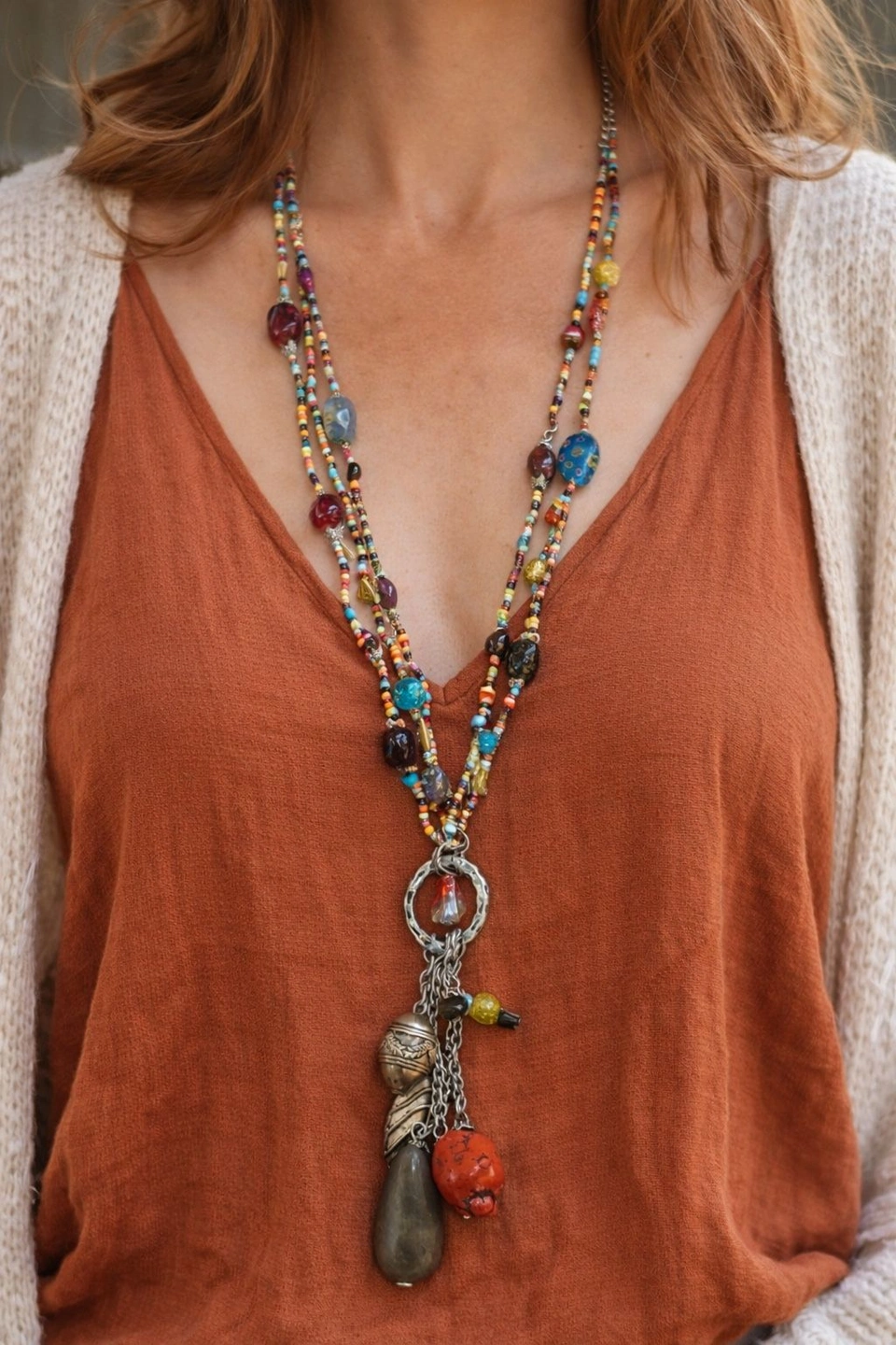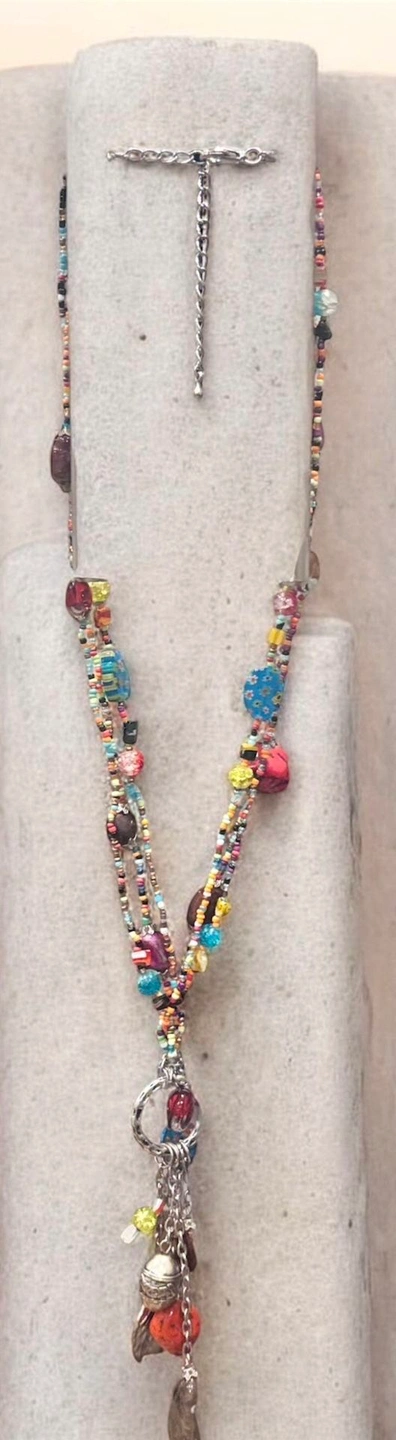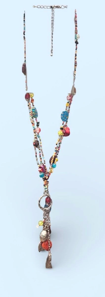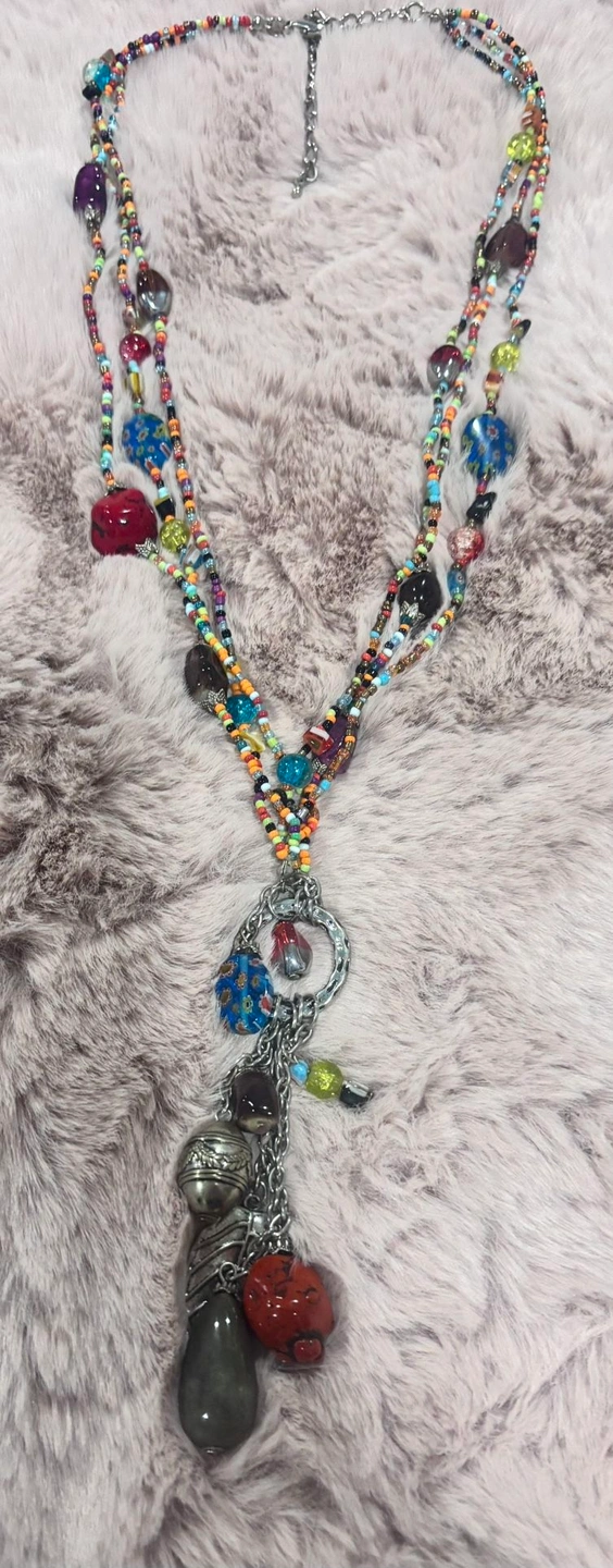 One-of-a-kind, handcrafted bohemian statement necklace featuring multiple strands of colorful seed beads, mixed glass beads, and an eye-catching charm cluster drop. This long, layered design creates beautiful movement and texture, making it perfect for festivals, travel, casual outfits, or elevating a simple dress or top. The pendant features a mix of glass and metal charms with an eclectic, artisan feel. Finished with an adjustable chain closure for versatile styling and comfortable wear.