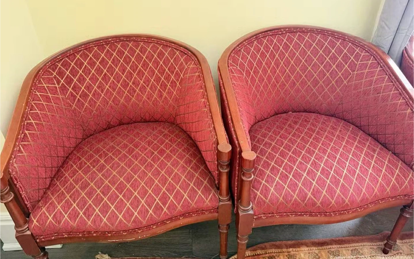 Two vintage barrel-back accent chairs with red and gold diamond pattern upholstery. Solid wood frame with turned legs. They're stylish and would add a touch of classic charm to any room. Perfect for a living room or as reading chairs.