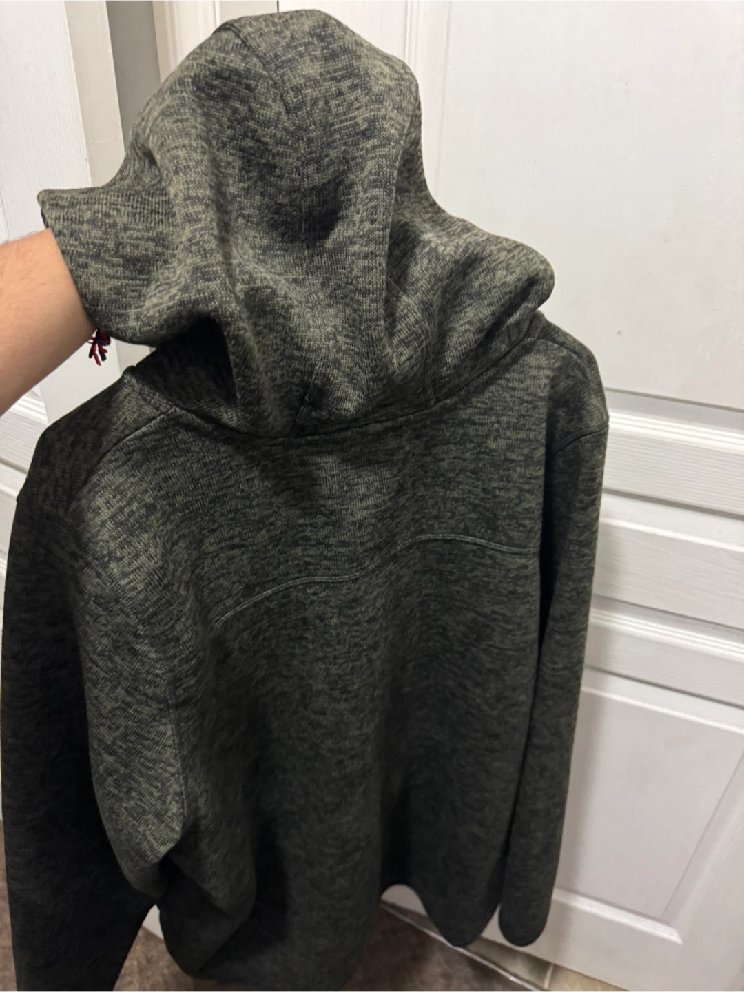 Active Zone full zip hoodie jacket in a heathered green and black pattern. It's made of a fleece material and has a drawstring hem. Perfect for staying cozy indoors or for casual wear outdoors. Keeps warm.