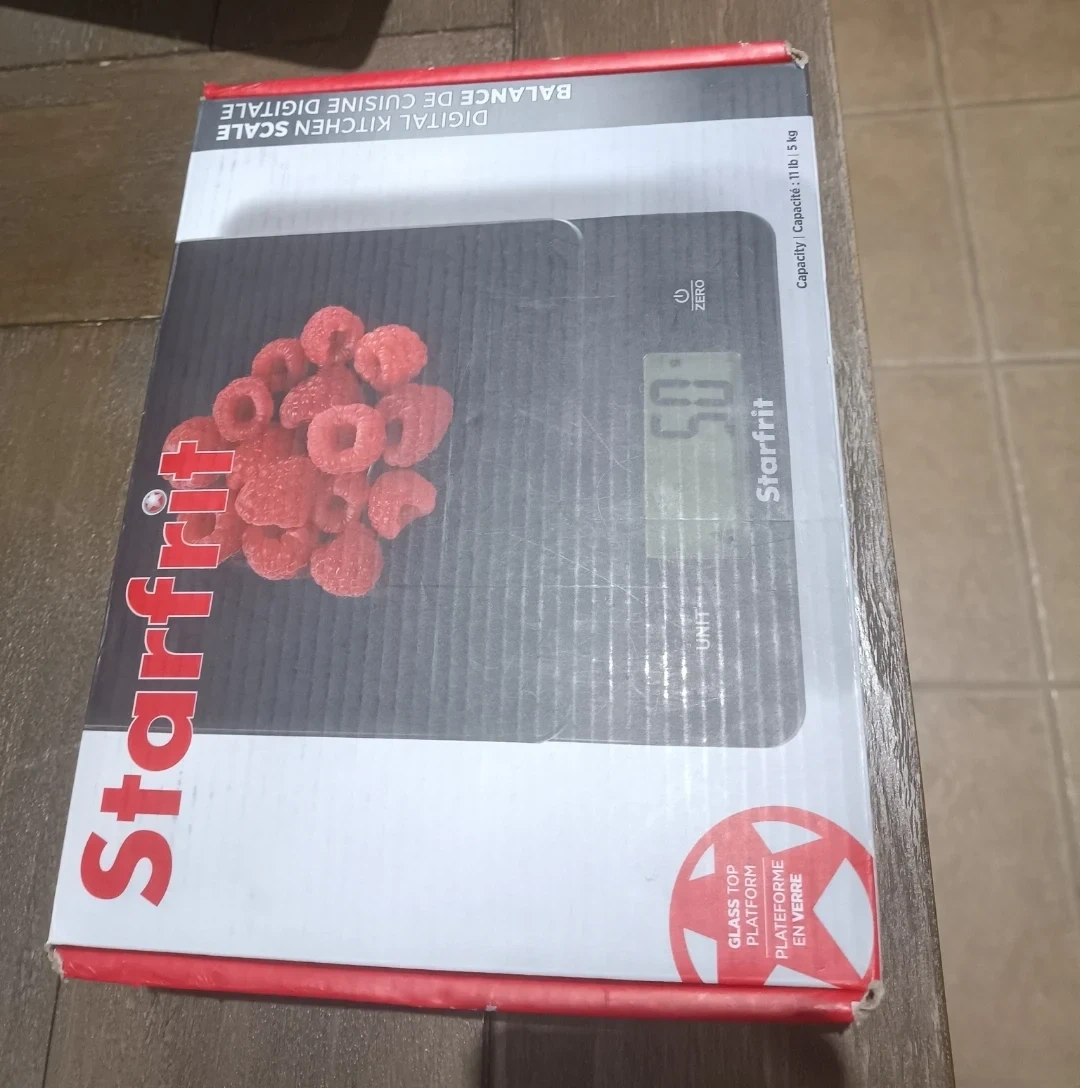 This Starfrit digital kitchen scale has a glass top platform. It's designed for precision weighing in the kitchen. Capacity is 5 lb or 11 lbs.