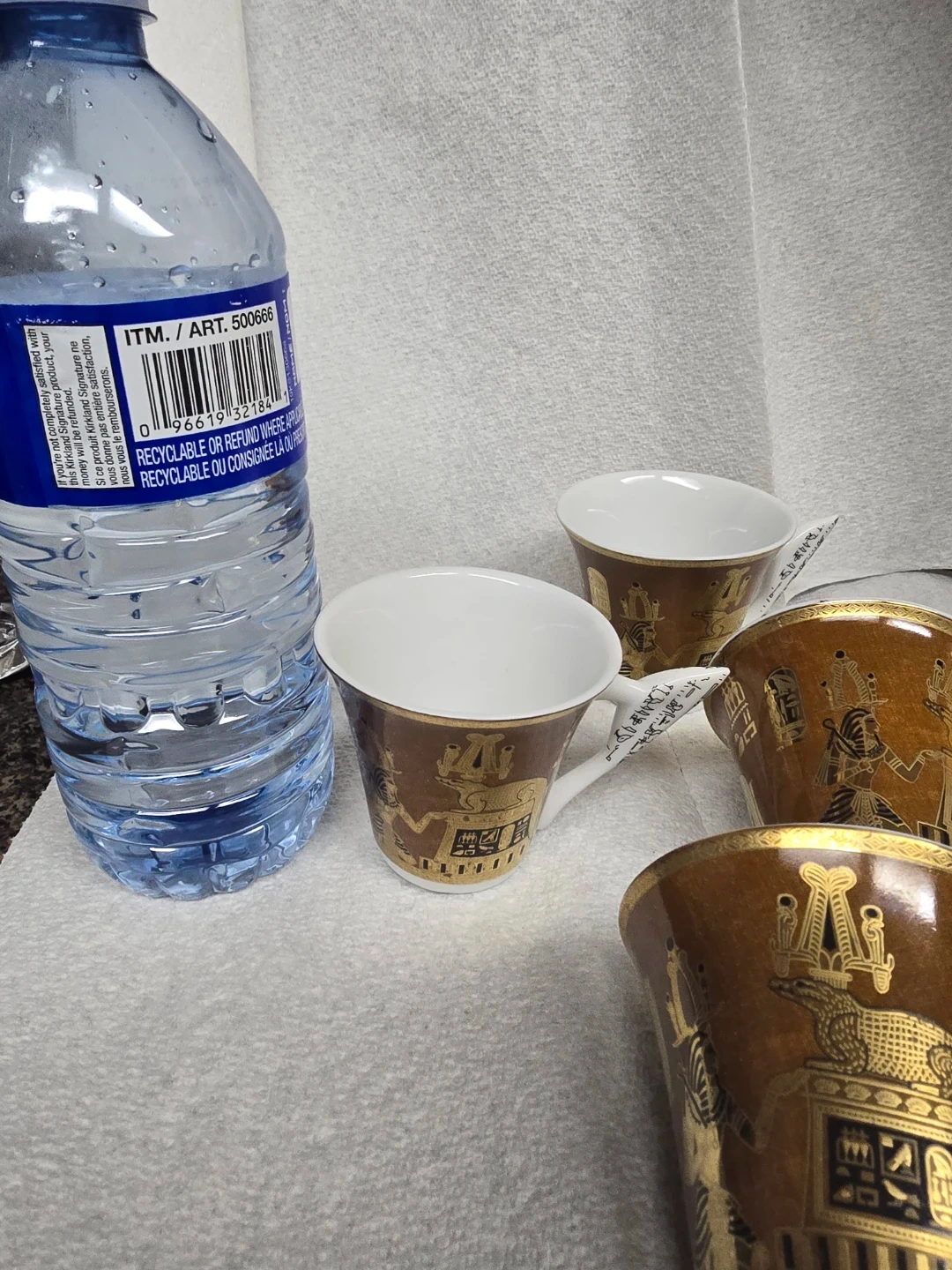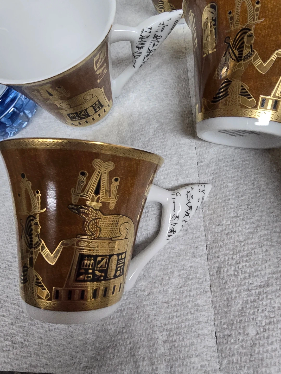 Set of five espresso cups from Fathi Mahmoud, made in Egypt. Features "Pâte et email Limoges fondé en 1942" detailing. These cups have a beautiful Egyptian-inspired design with gold accents.