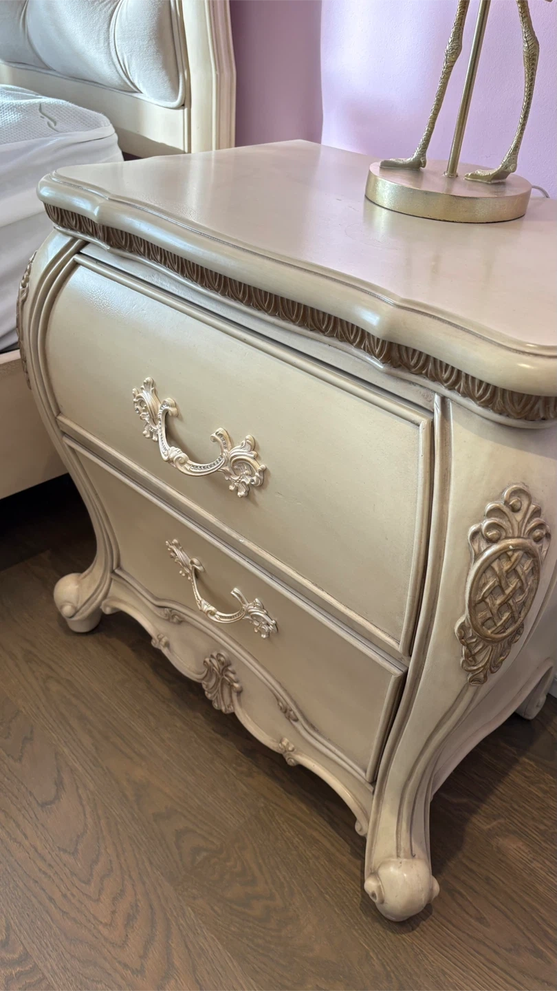 Elegant French Provincial style bedroom set. Includes a tufted headboard bed frame and a matching dresser with ornate carvings and gold accents. The colour is a classic cream or off-white with distressed detailing. This set would be a beautiful addition to a master bedroom or a princess-themed room!