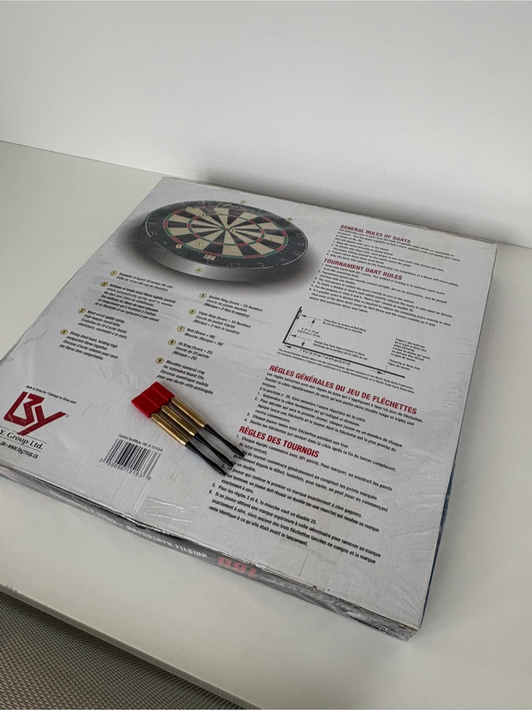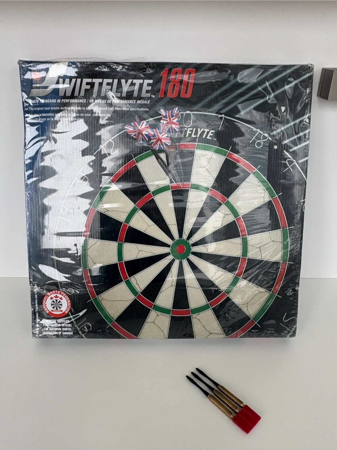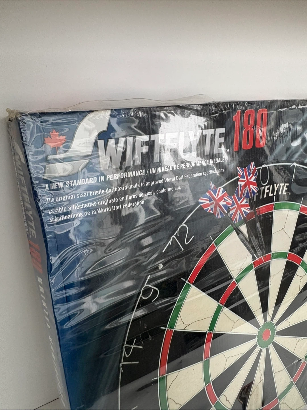 It’s a brand new and sealed SWIFTFLYTE 180 bristle dartboard made from sisal fibres and is approved for World Dart Federation specifications. The diameter is 18 inches (45 cm).
