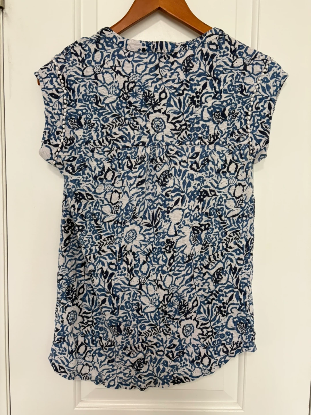 Linen top size women’s medium (10). Great condition! Blue and cream coloured pattern. See my other linen tops. Pick up near Sherbourne and Adelaide st east or sometimes at some TTC stations.
