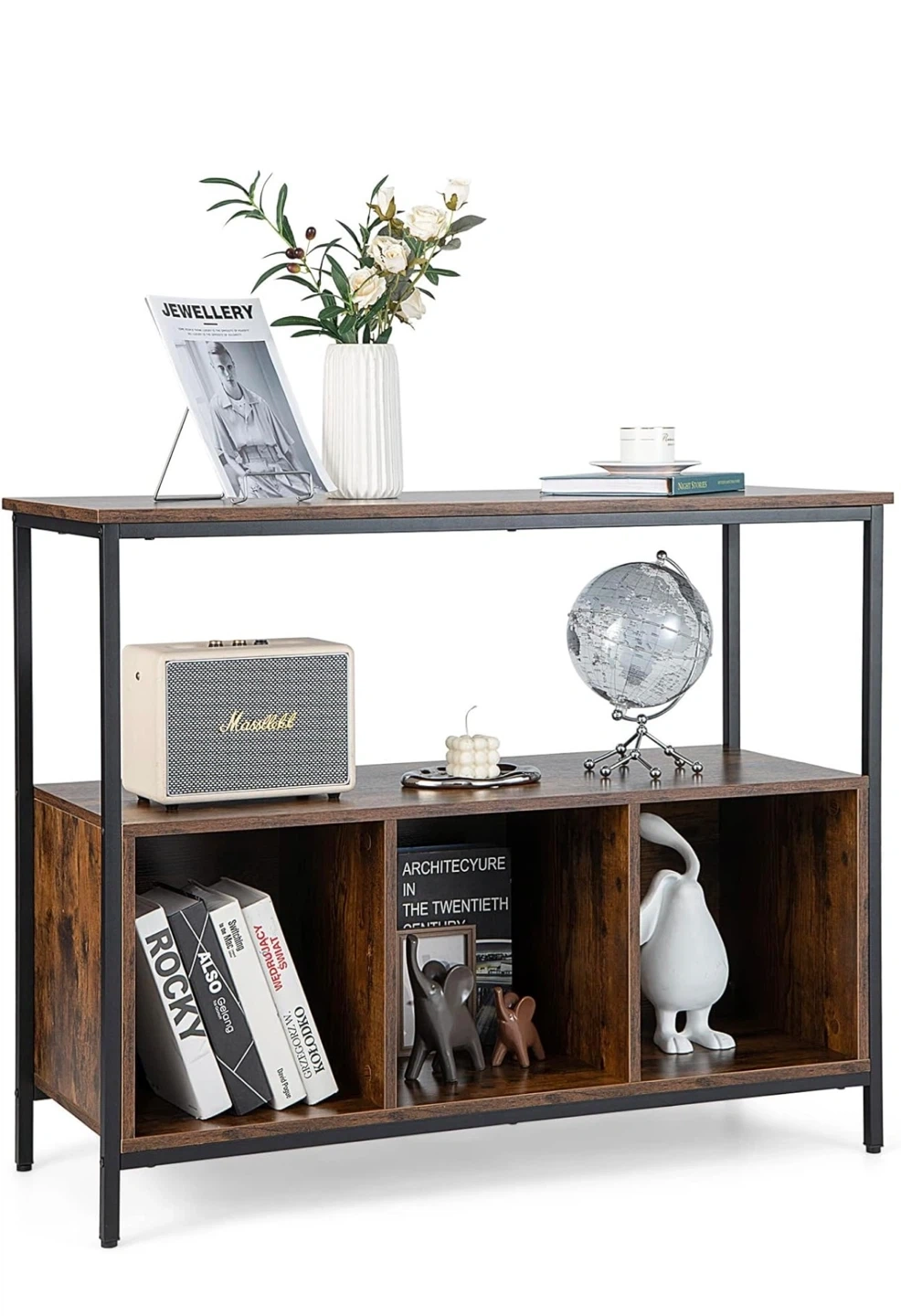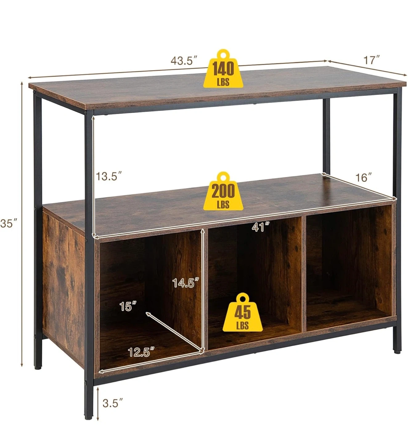 This console table features a rustic wood finish with a metal frame. It's 43.5" wide and 17" deep with a height of 35". The bottom shelf has three open storage cubbies. This piece would be useful for organizing items in an entryway or living space.