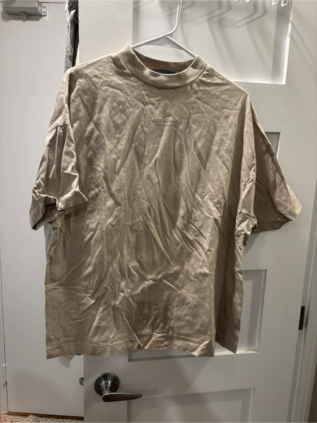 This is a tan t-shirt from Fear of God Essentials. It's made of cotton and has a relaxed fit. The minimalist design makes it a versatile piece.