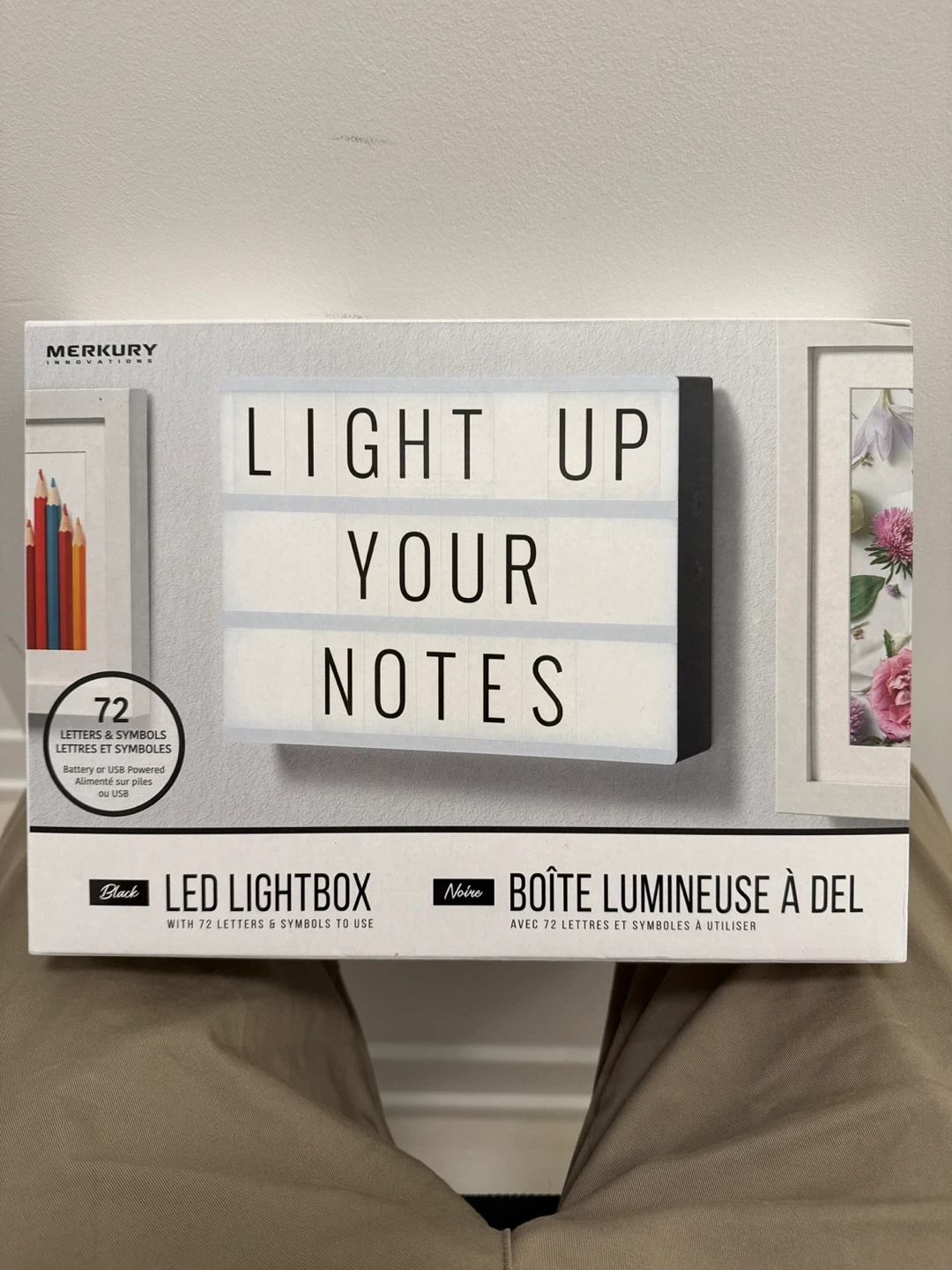 Merkury Innovations LED Lightbox in black. It's battery or USB powered and comes with 72 letters and symbols to use. Light up your notes with this fun display!