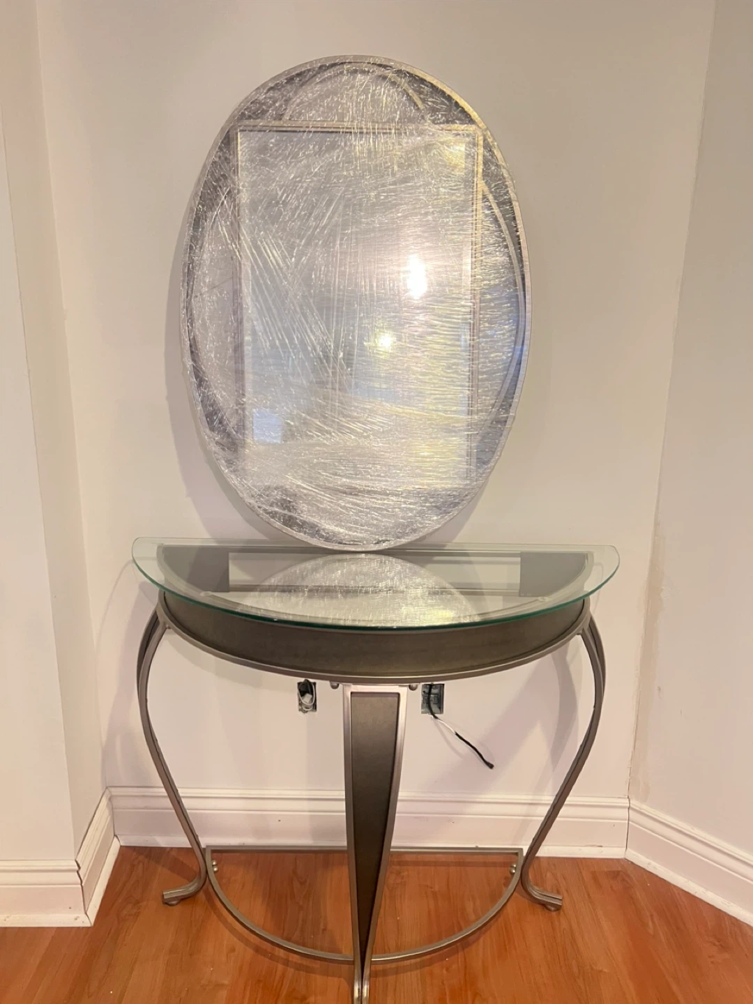 This set includes an oval mirror, wrapped in plastic for protection, and a console table with a glass top. The console table has a curved metal base and a dark grey accent panel. It's suitable for an entryway or living space.