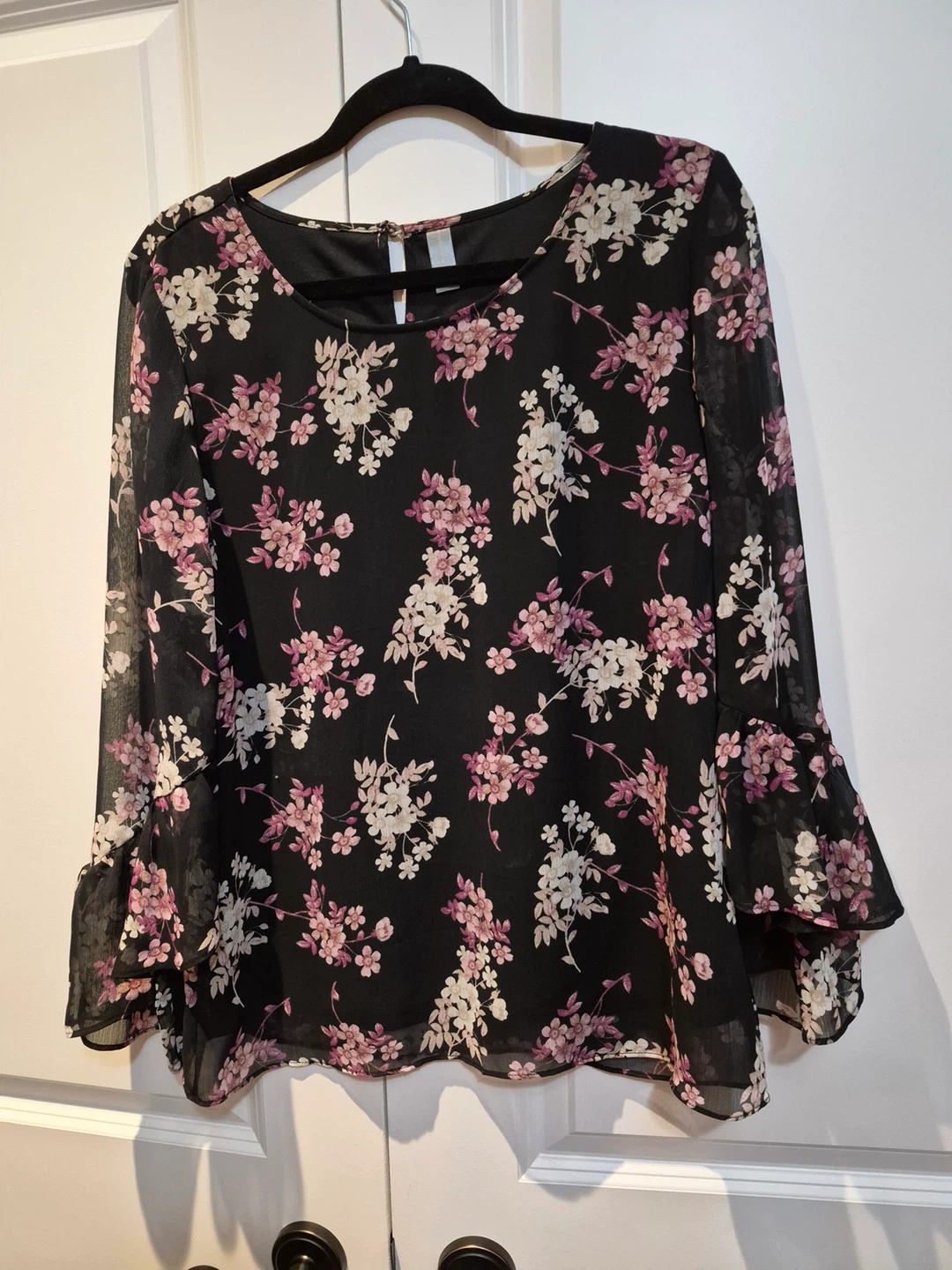 Black Print Blouse, purchased from Denver Hayes, body is lined, sleeves unlined, back neck keyhole opening with button closure, 100% Polyester. size Small, $12 or best offer.