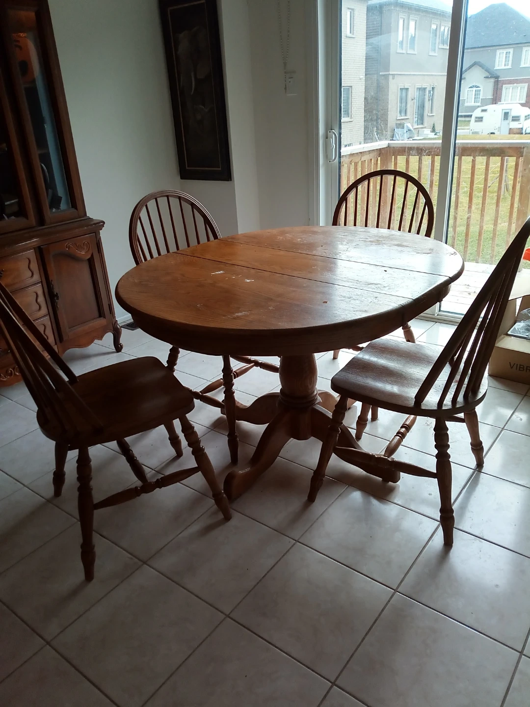 A lovely wooden dining set. It includes an oval-shaped table with a pedestal base and four matching chairs. This set's classic design would suit any dining space. Great for smaller gatherings or everyday meals!