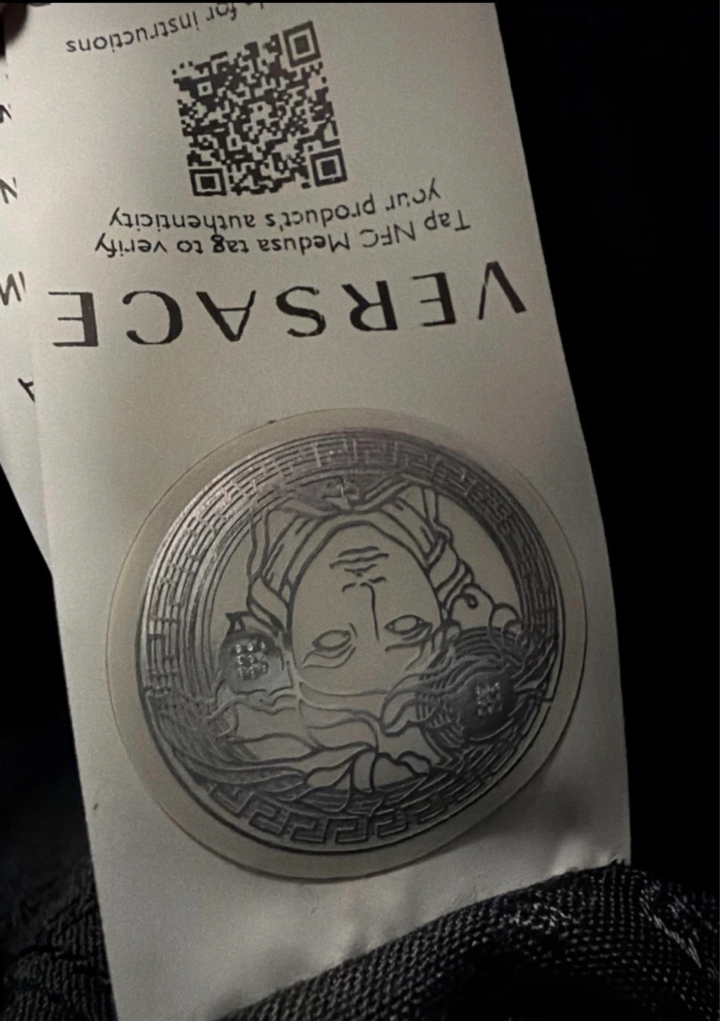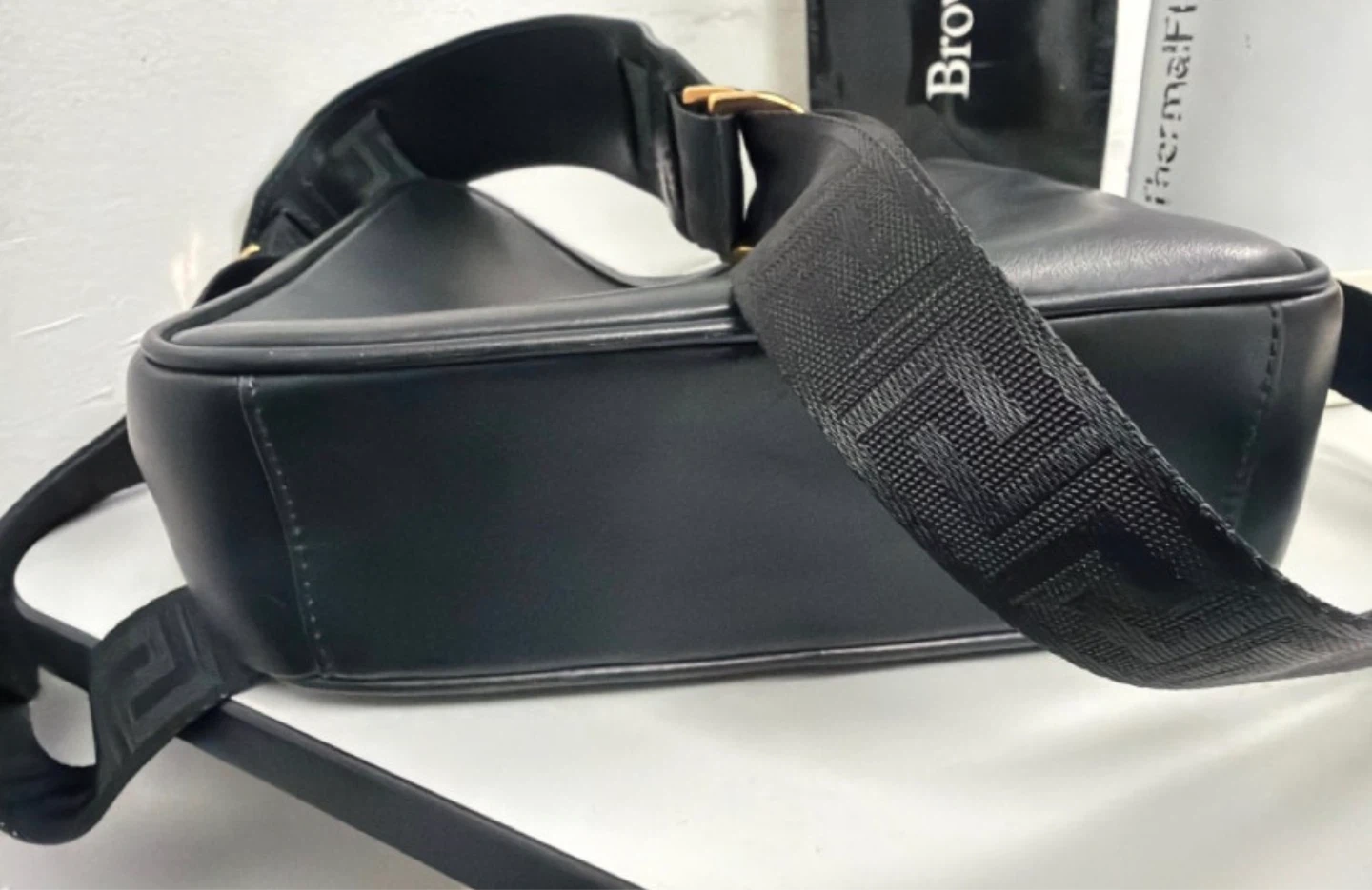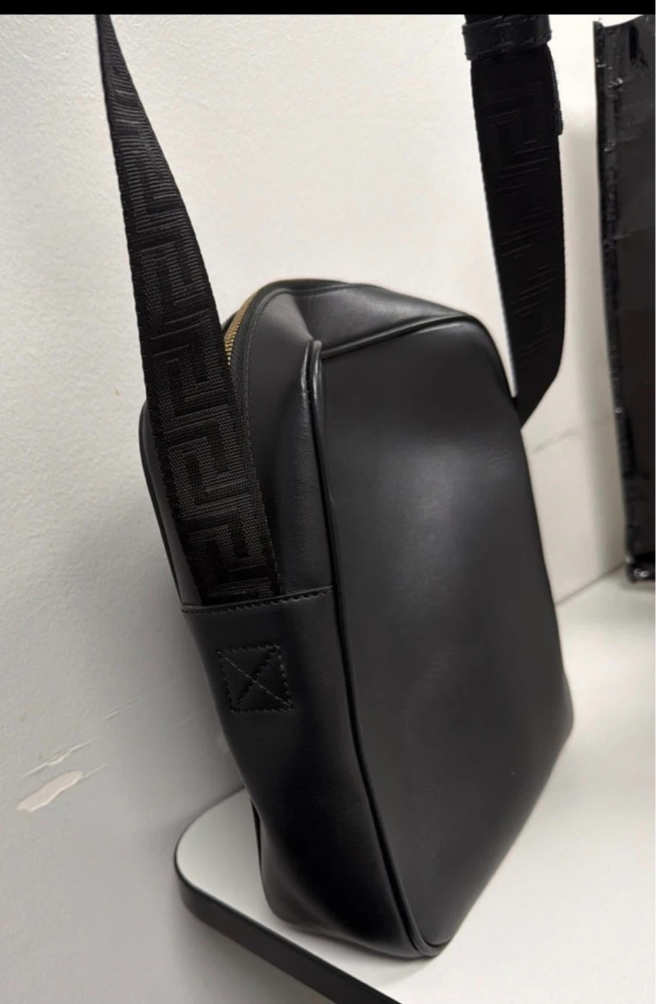 Versace black leather crossbody bag, featuring the iconic Medusa emblem. This used bag is in excellent condition, ready to add a touch of luxury to your everyday carry