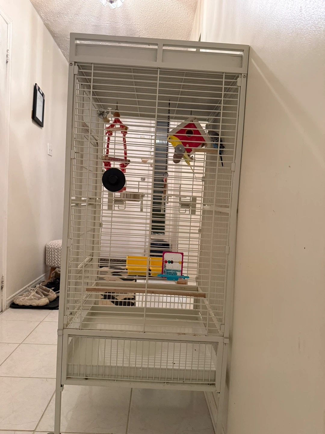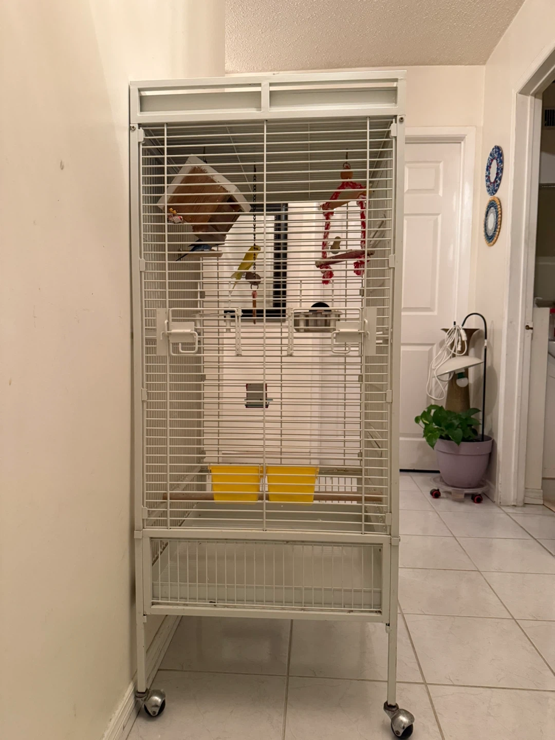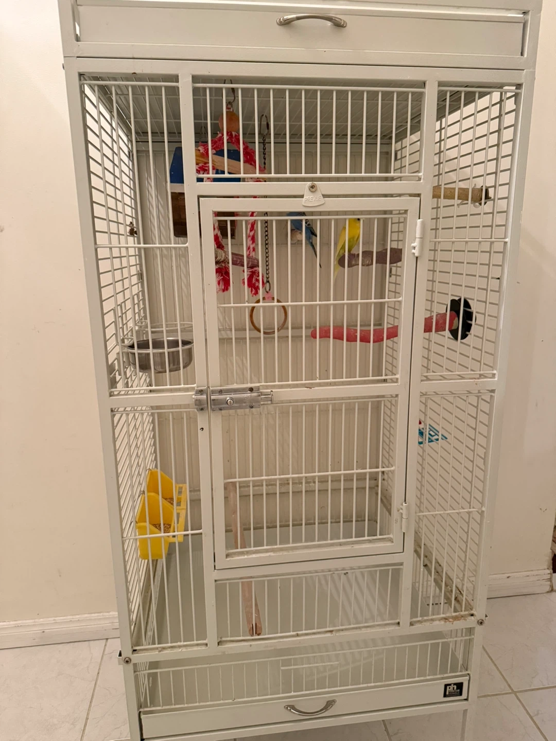 Spacious white bird cage, suitable for parakeets or other small birds. It's a tall, freestanding unit with multiple perches and feeders included. Includes a pull-out tray for easy cleaning. A great home for your feathered friends! Giving with 2 birds.