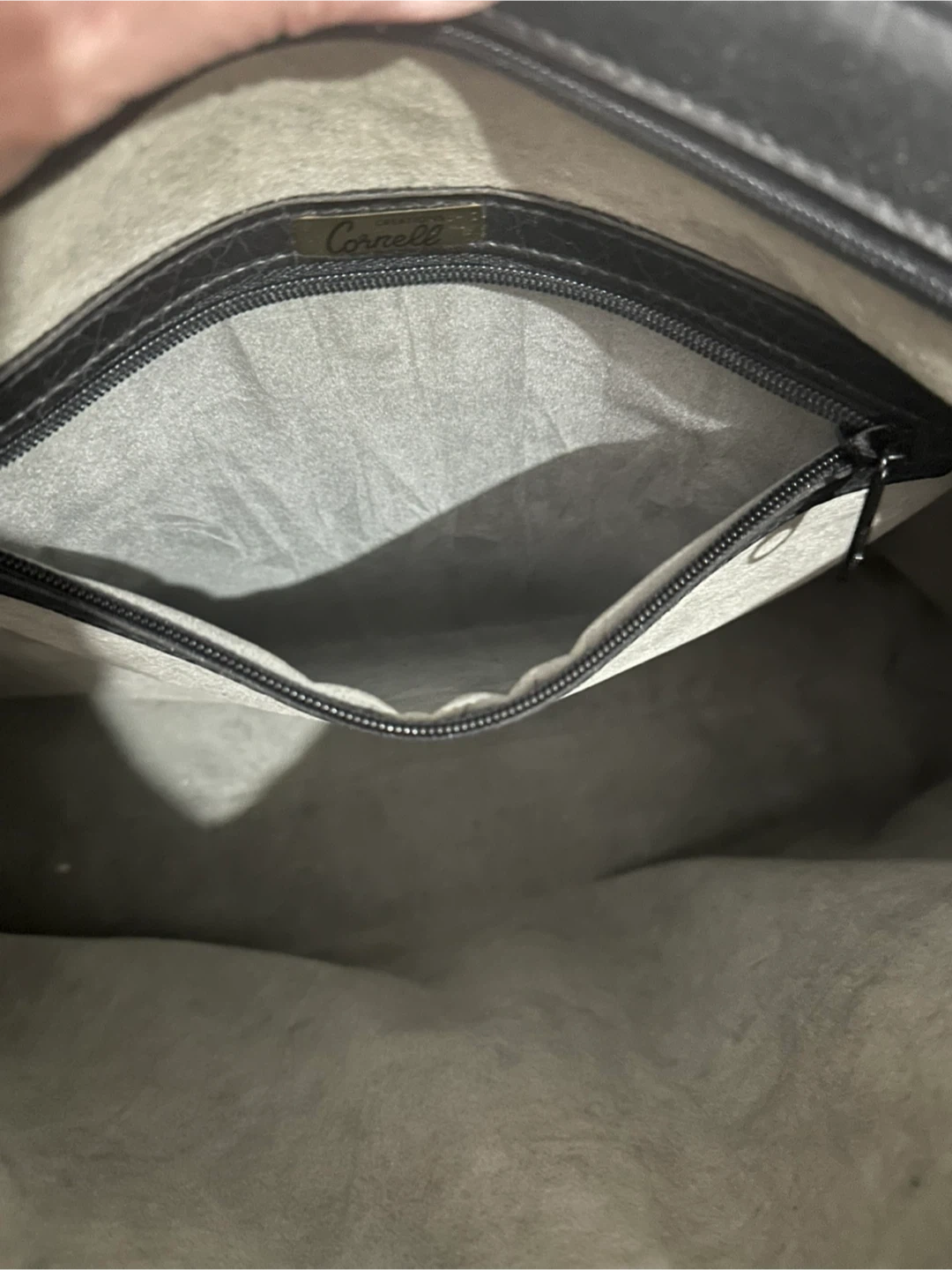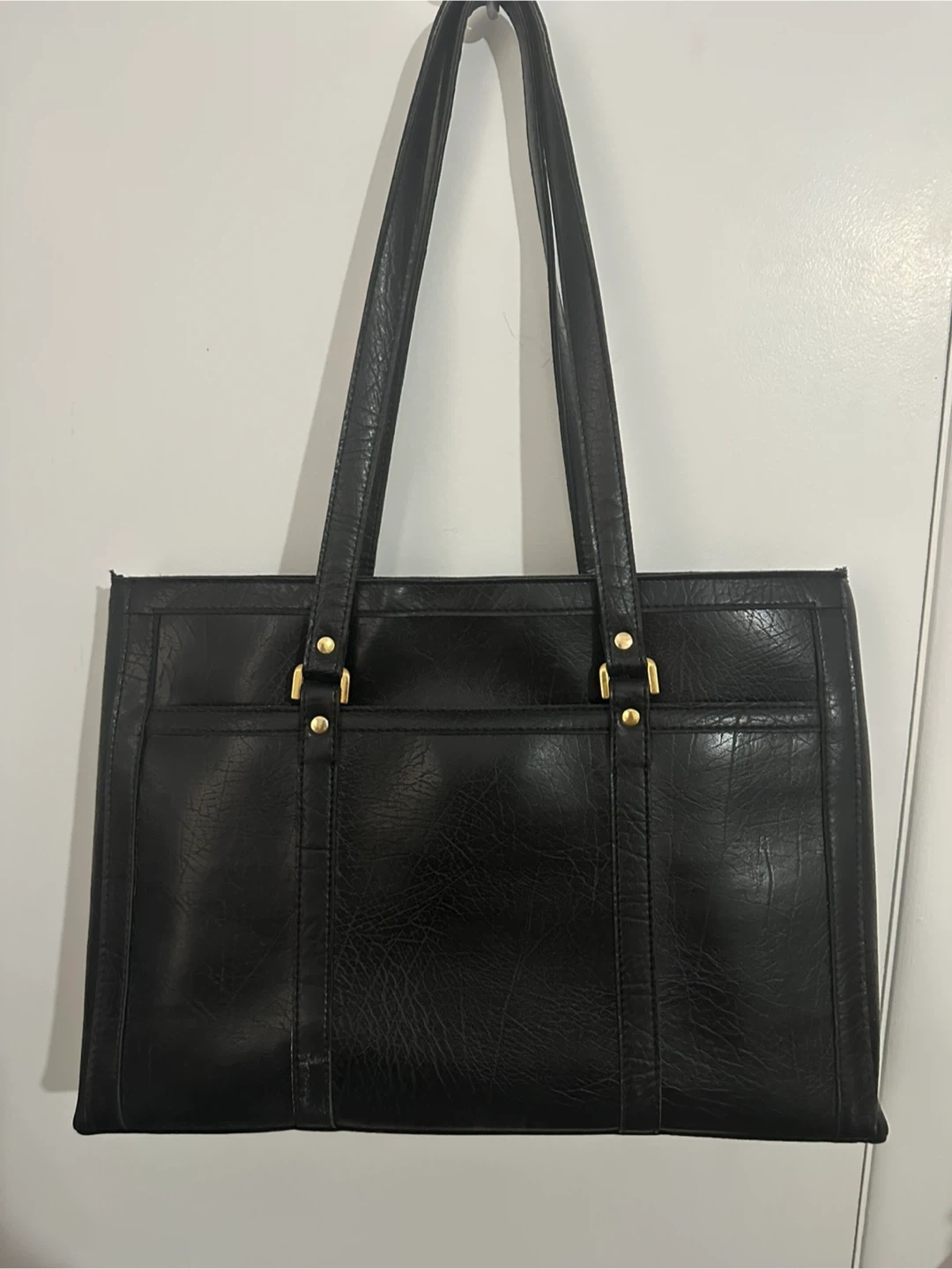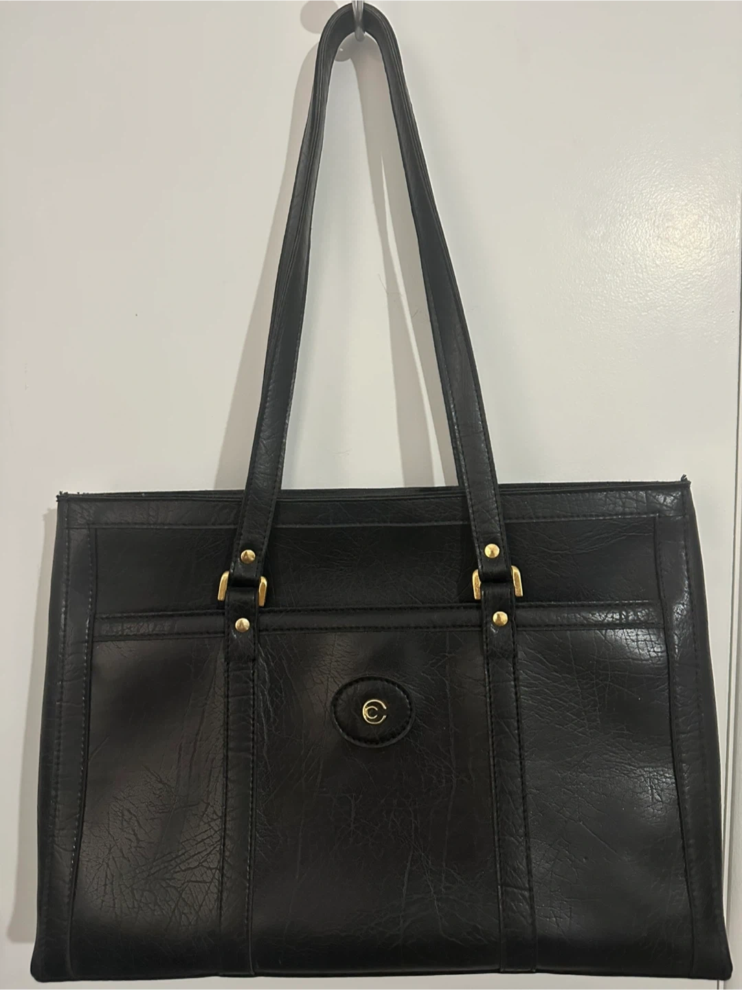 A versatile black tote bag from Cornett. It features a textured faux leather exterior with a snap closure and gold-tone hardware. The interior has a zippered compartment for secure storage. It's a classic style suitable for work or everyday use. Mildly used, zippers work and no major damage to exterior of purse. Smoke free home.