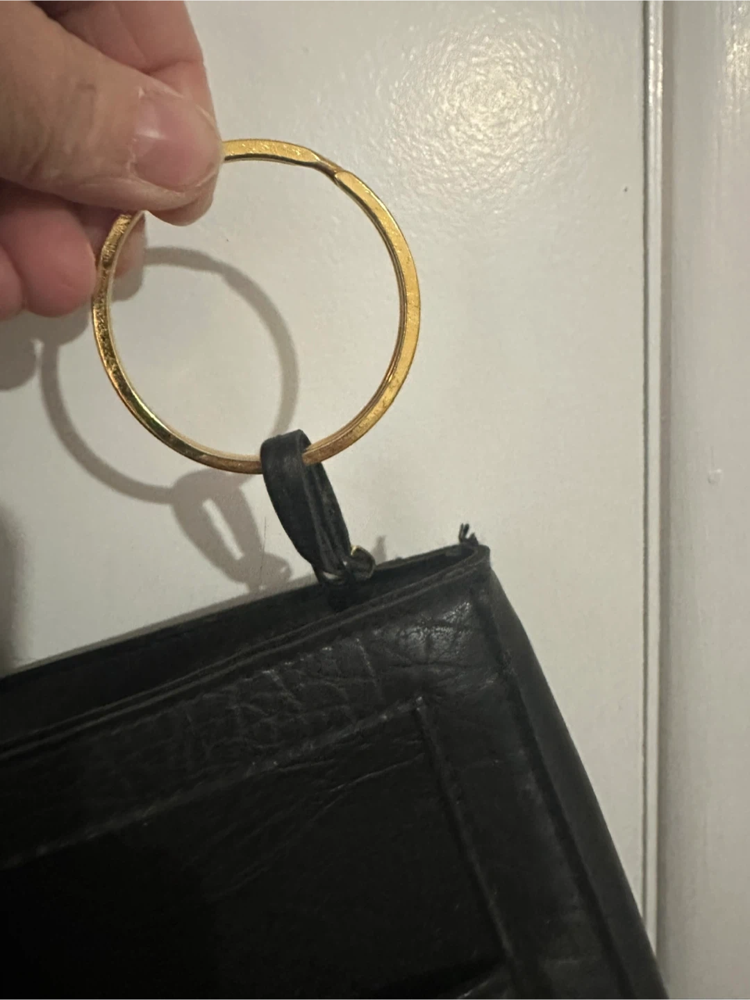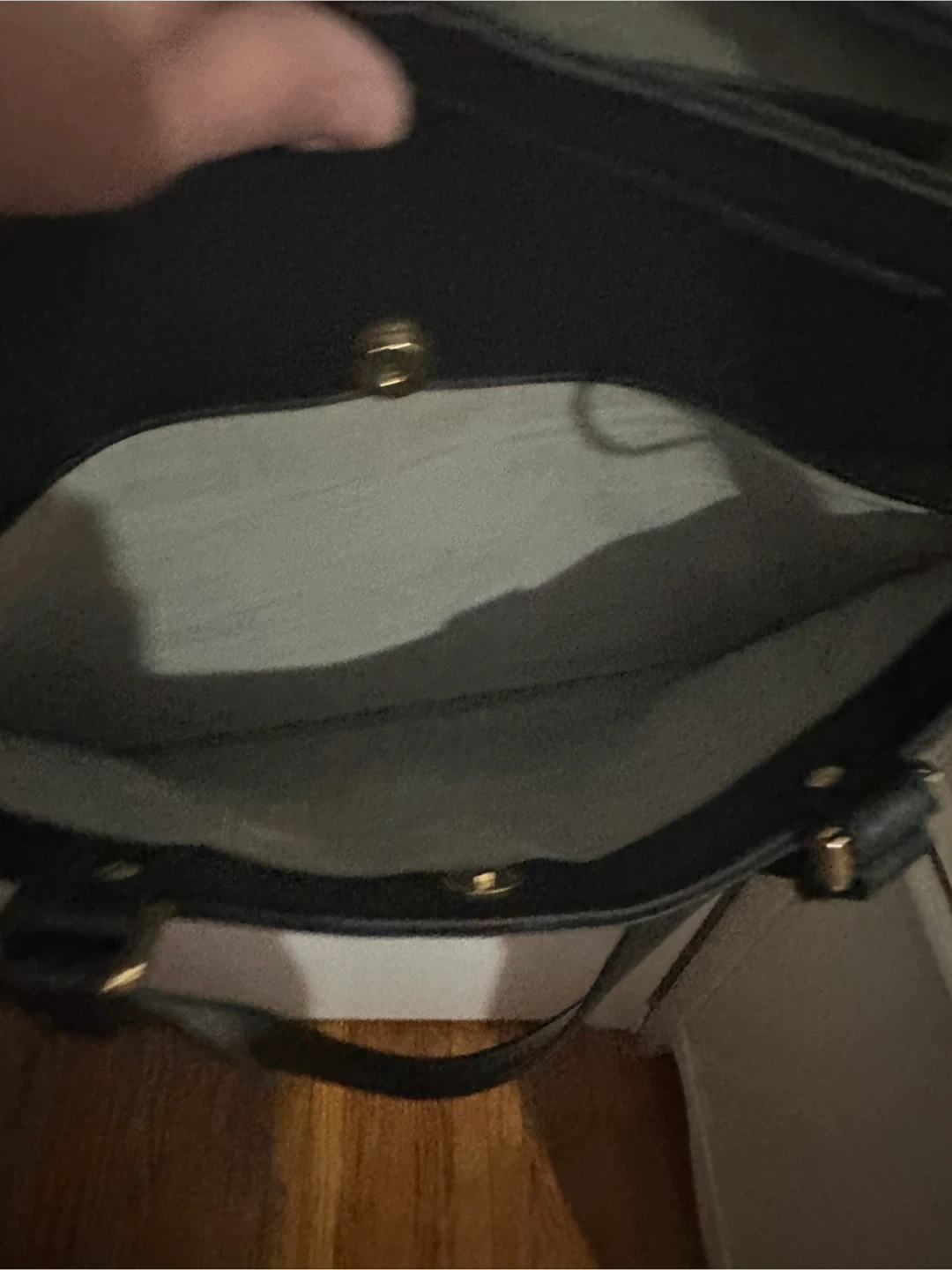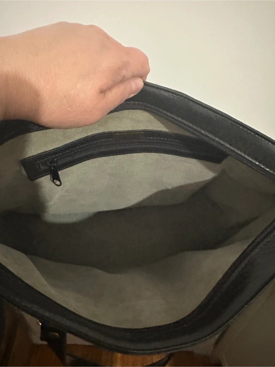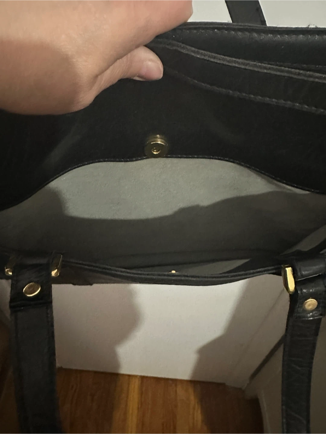 A versatile black tote bag from Cornett. It features a textured faux leather exterior with a snap closure and gold-tone hardware. The interior has a zippered compartment for secure storage. It's a classic style suitable for work or everyday use. Mildly used, zippers work and no major damage to exterior of purse. Smoke free home.