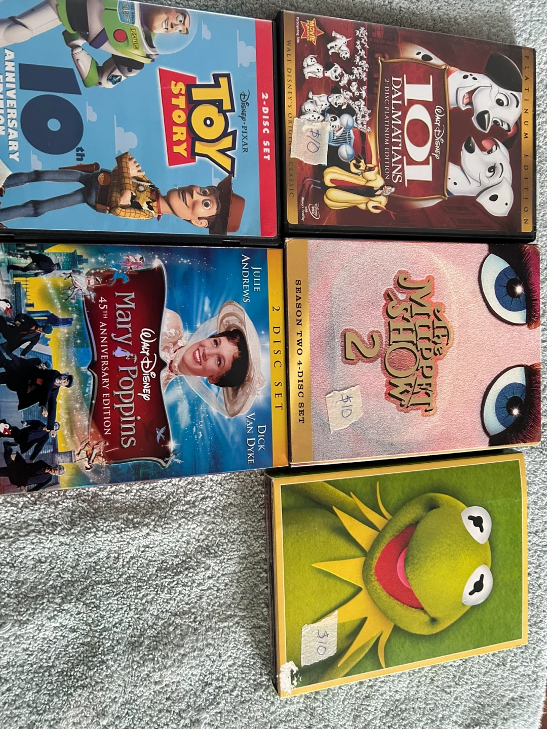 Collection of Disney DVDs including Toy Story (2-disc set), 101 Dalmatians (Platinum Edition), Mary Poppins (45th Anniversary Edition), and The Muppet Show (Season Two, 4-disc set). Great for Disney fans!