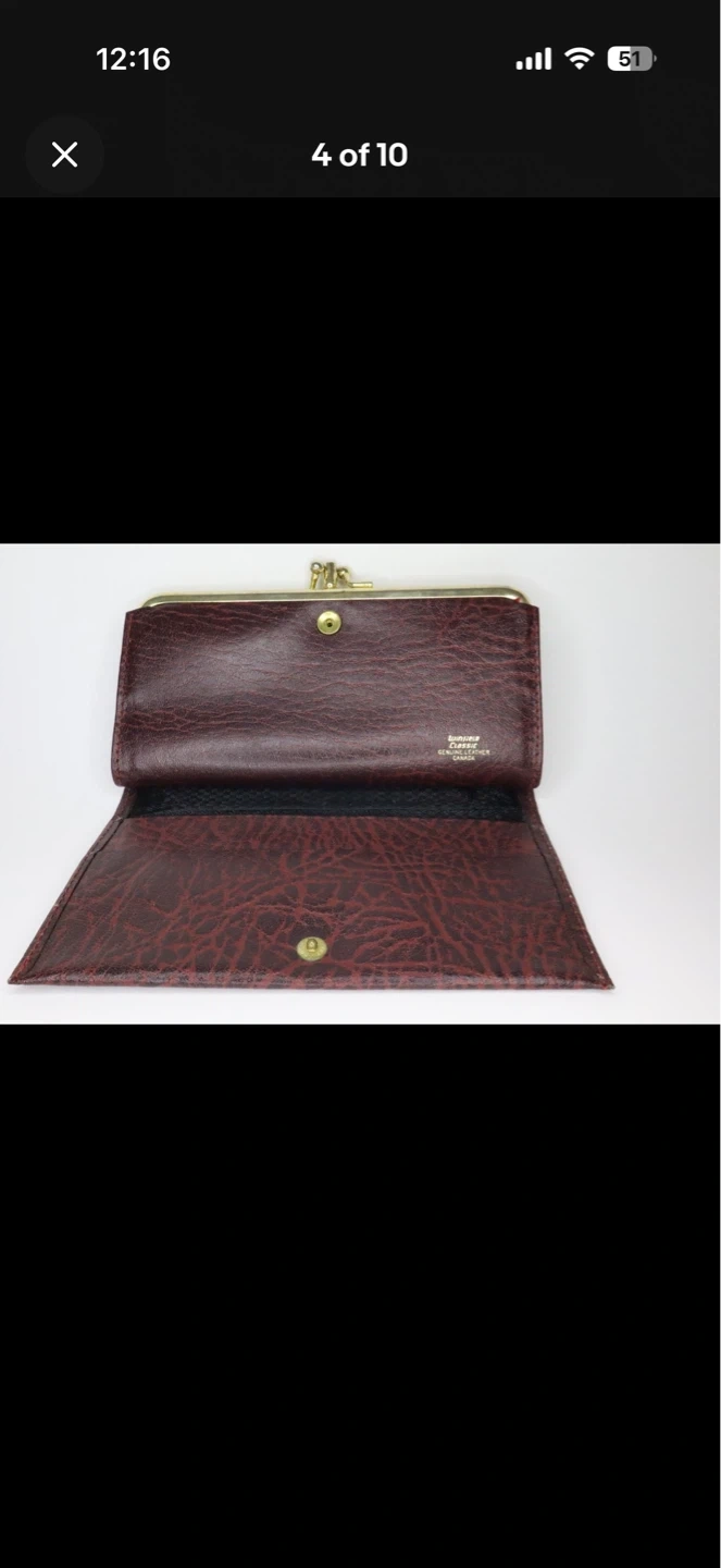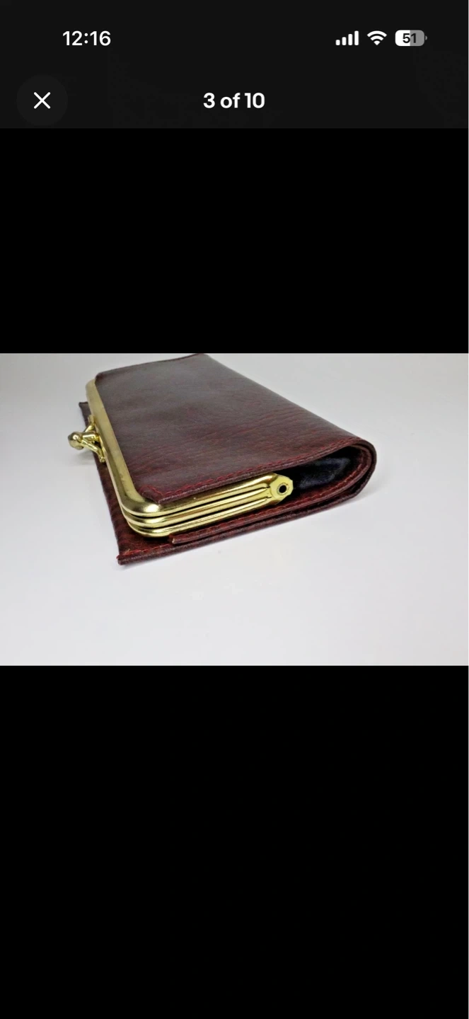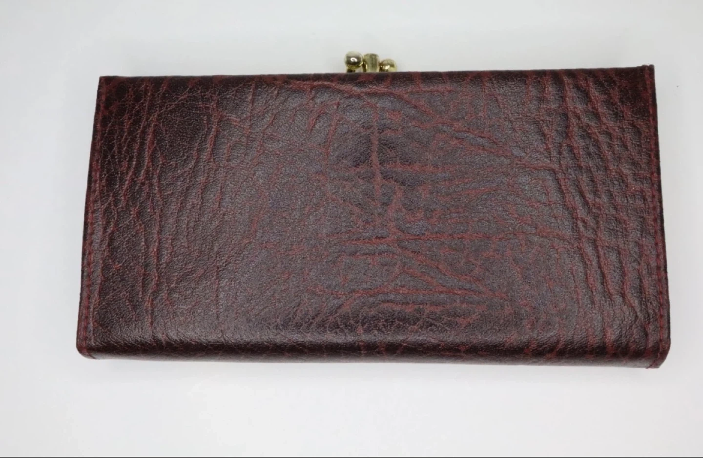 Textured leather clutch wallet in a rich deep burgundy. Kiss-lock metal clasp closure. Sleek rectangular silhouette. Timeless and versatile accessory.