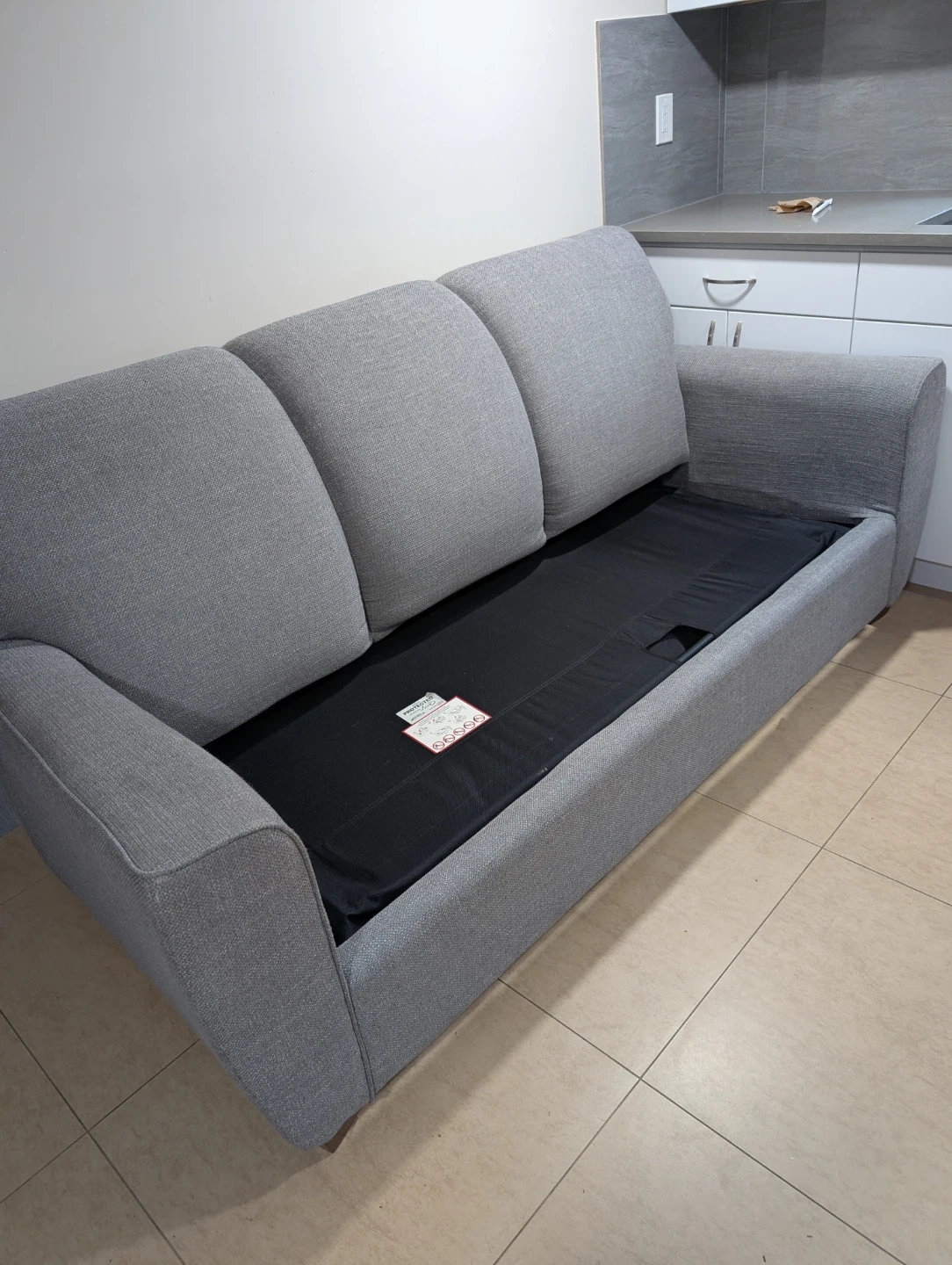 This is a grey sofa that easily converts into a sofa bed. It features a pull-out mattress for comfortable sleeping. The sofa has a modern design and a durable fabric. It's perfect for small spaces or for guests! Comes with two pillows.