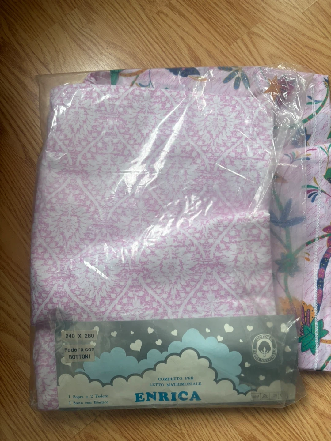 This is a queen size bedding set by Enrica. It includes one top sheet and two pillowcases. Made with 100% natural cotton.