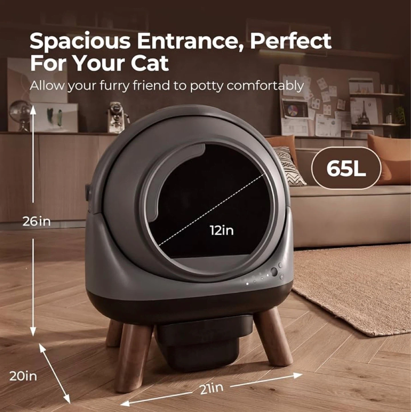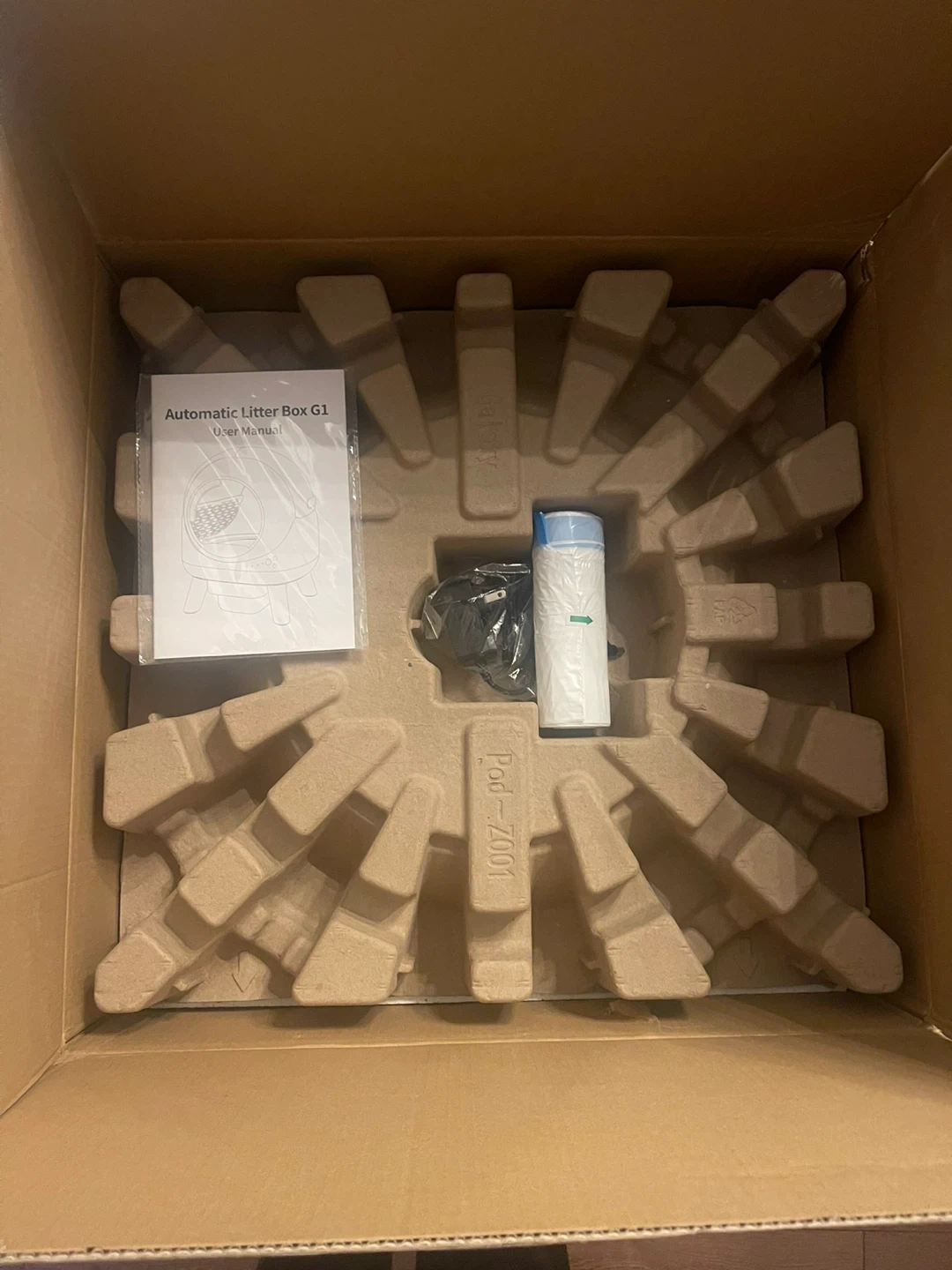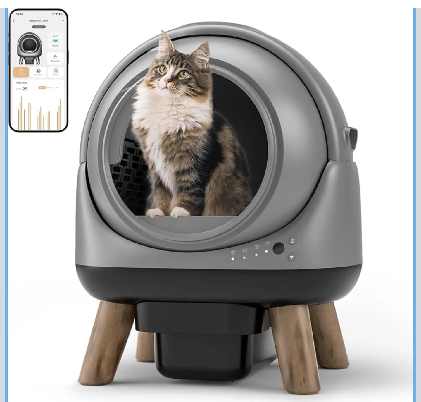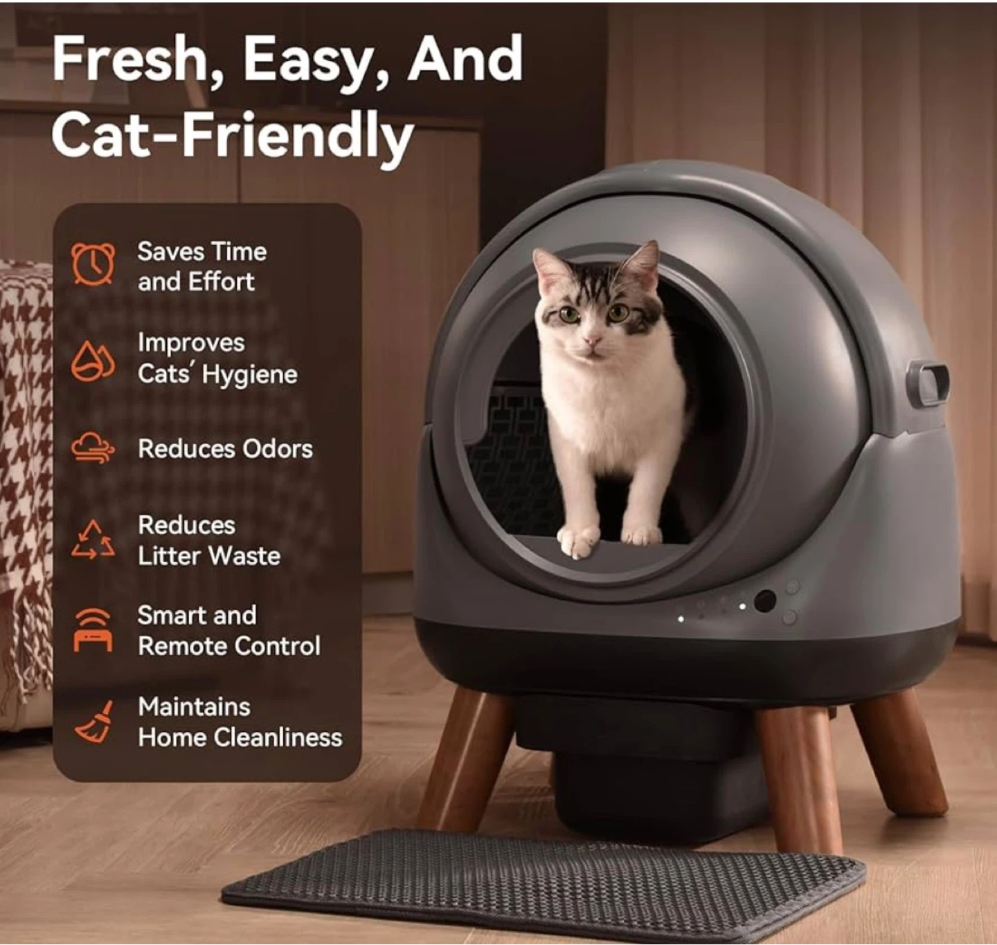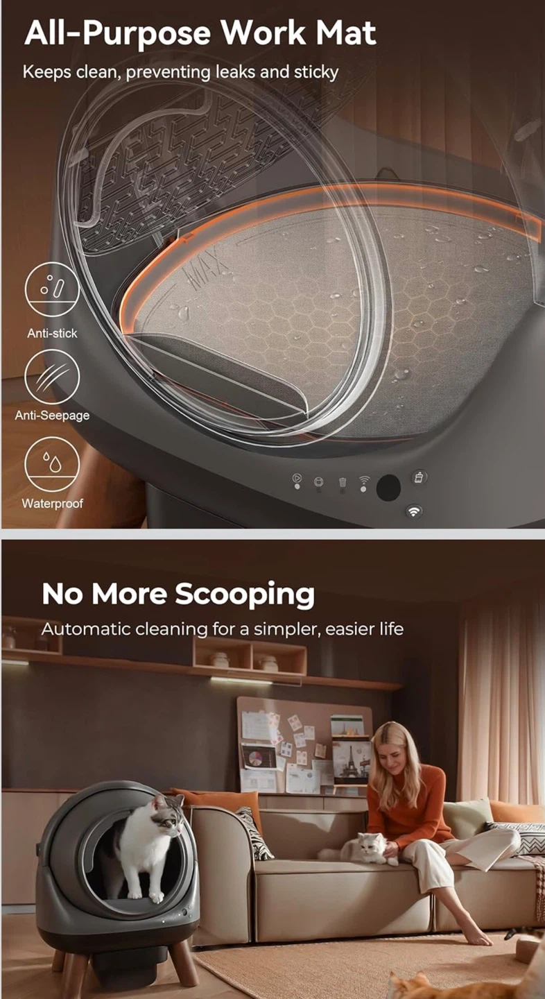 This automatic litter box saves time and effort, reducing odours and litter waste. It features smart and remote control for convenience. Includes original box and user manual.