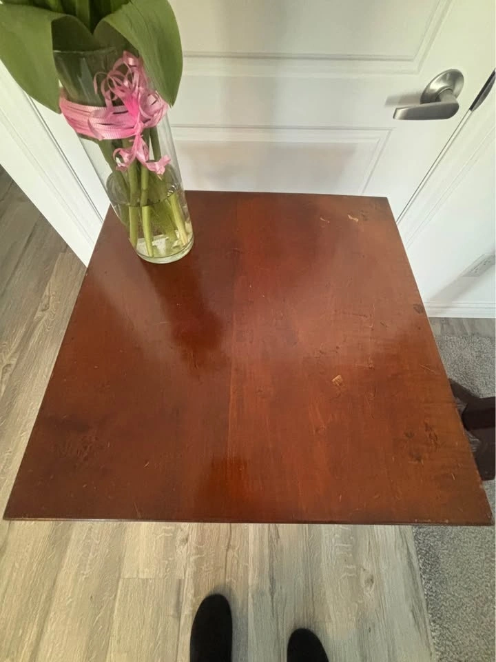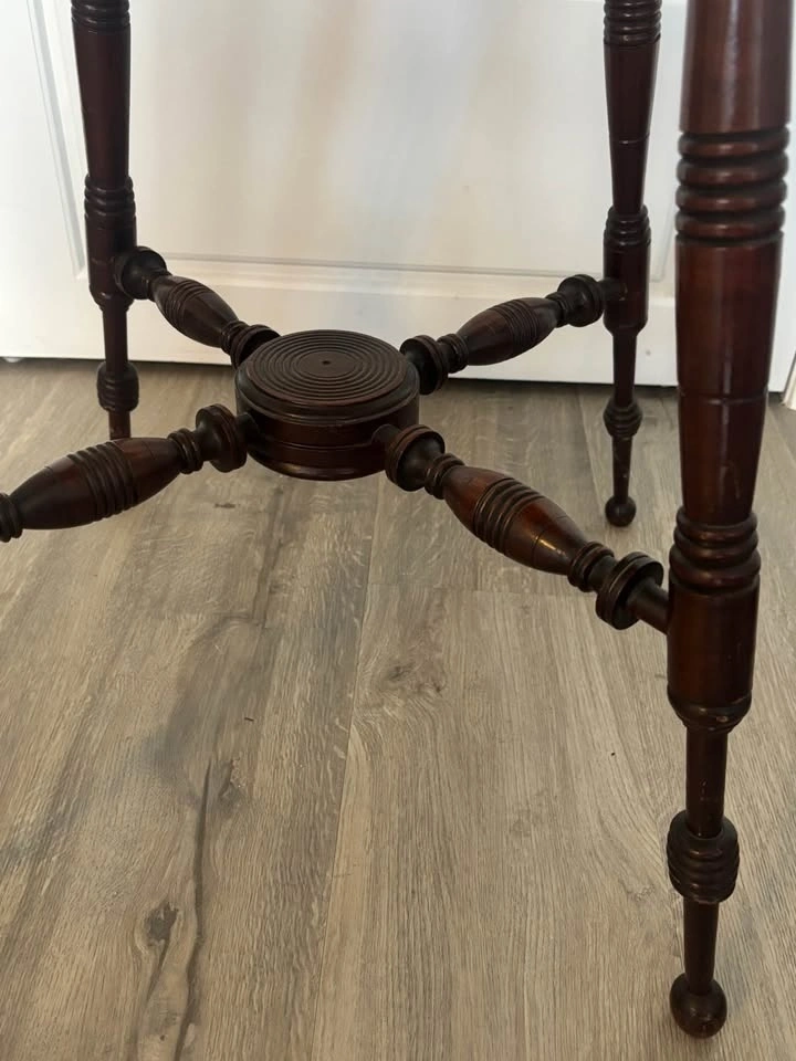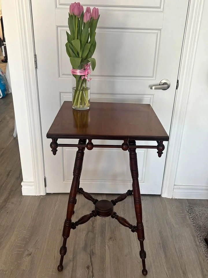 Very detailed Victorian side table made of mahogany. Height is 29 inches and the top is 18" x 18". The top has a slight mark and the table could use re-gluing, however, it is currently in original condition. Feel free to message if you have any questions!