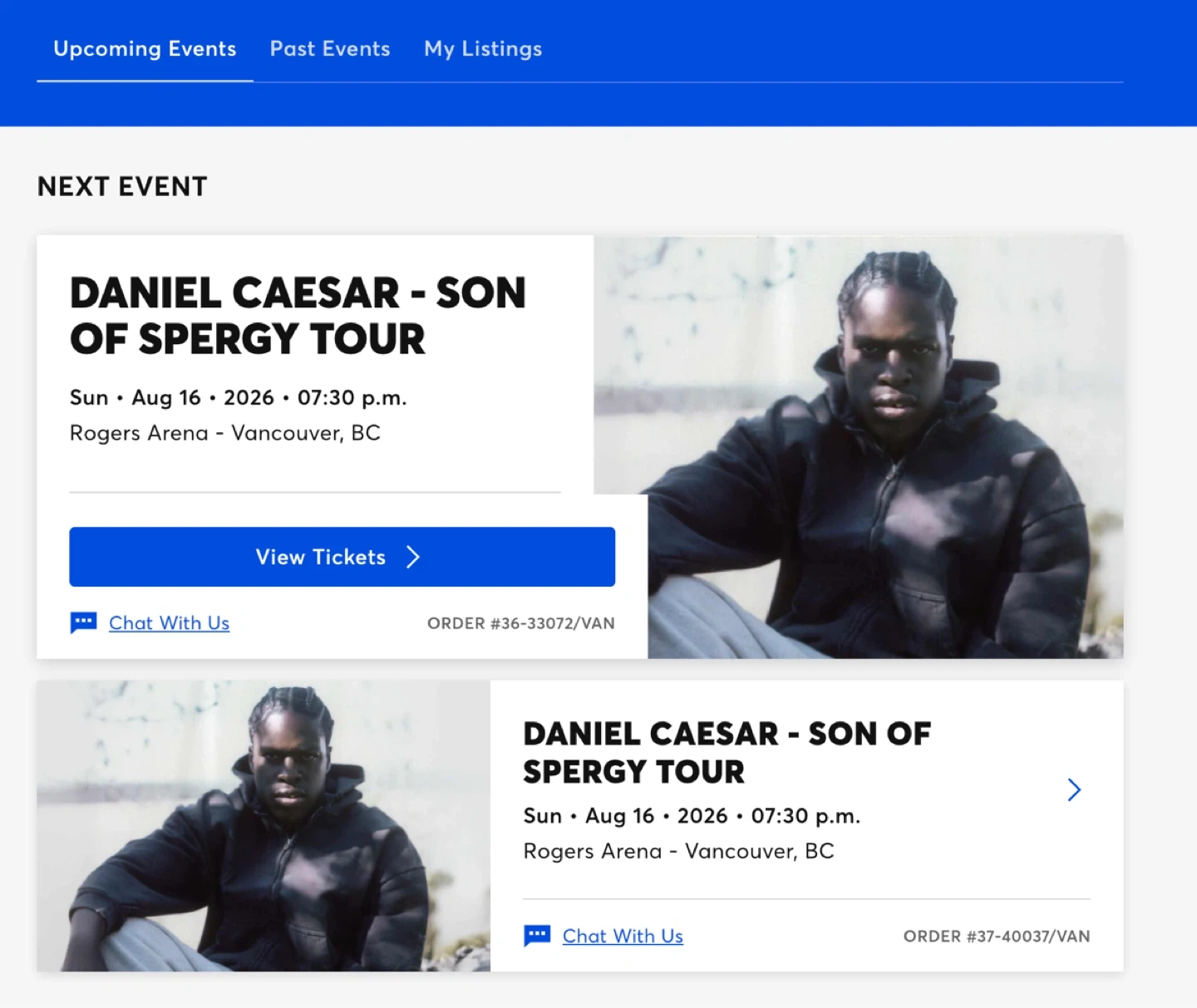 Ticket for Daniel Caesar's "Son of a Spergy Tour" at Rogers Arena in Vancouver, BC on August 16th, the second photo is the view