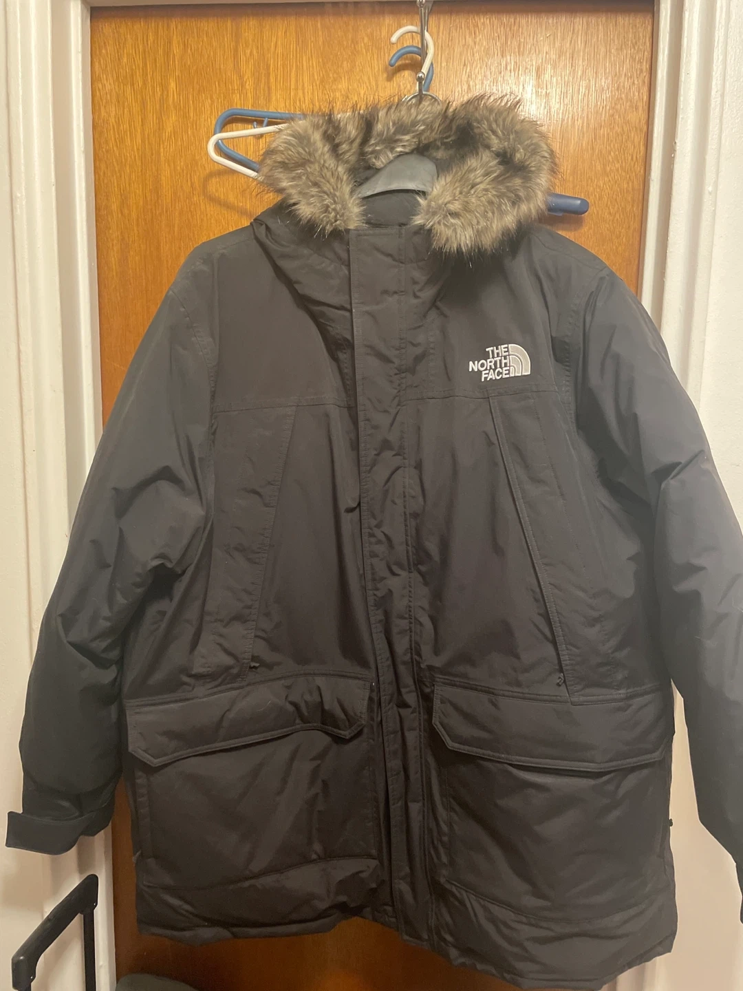 Selling a black The North Face parka. It's in great condition and ready to keep you warm! Features a fur-trimmed hood and plenty of pockets.