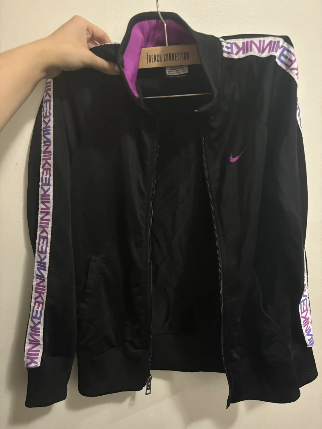 Black Nike track jacket with purple accents on the collar and logo. Features the Nike repeat logo on the sleeves. Made with a lightweight material.