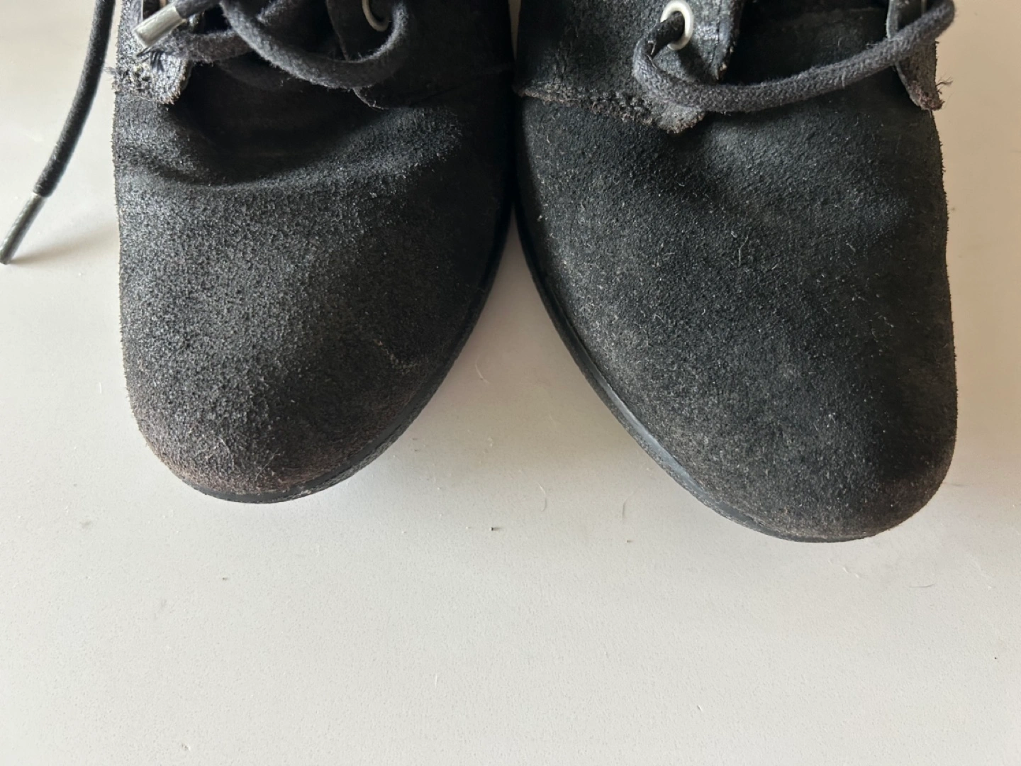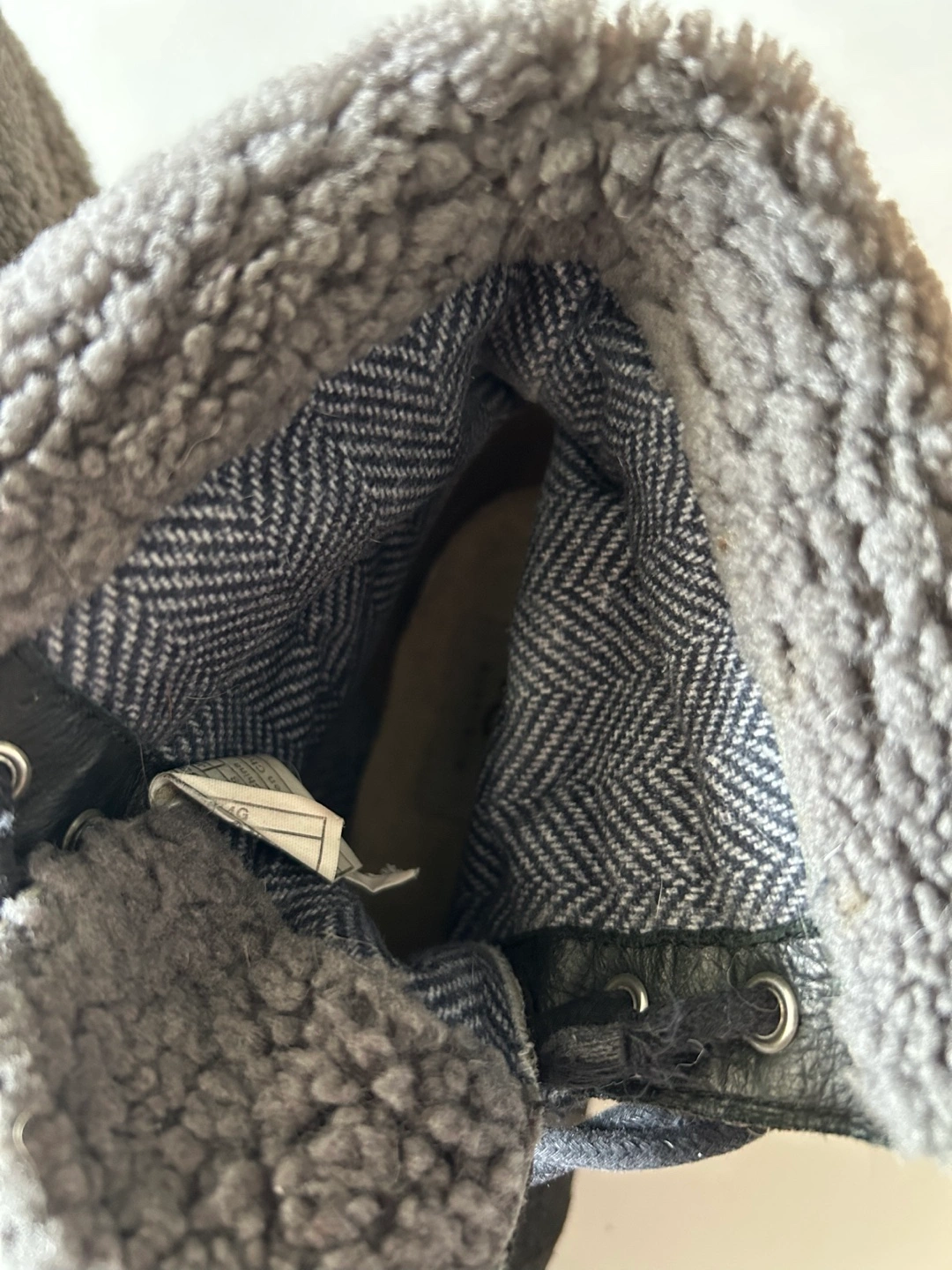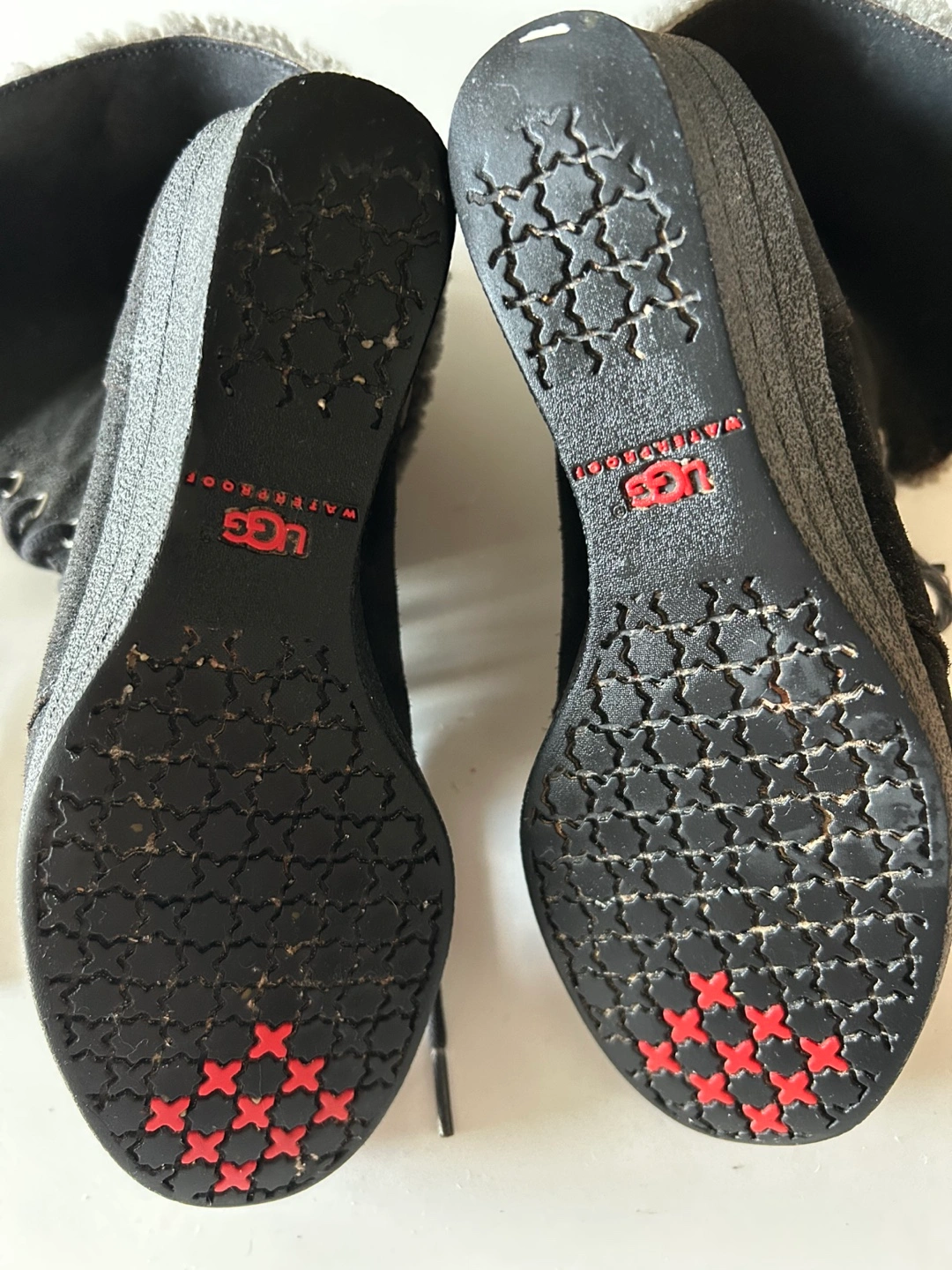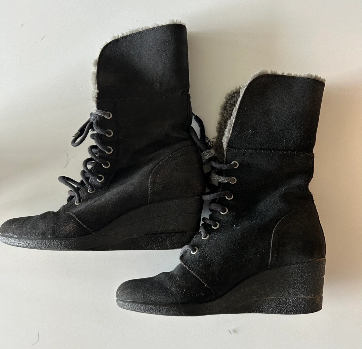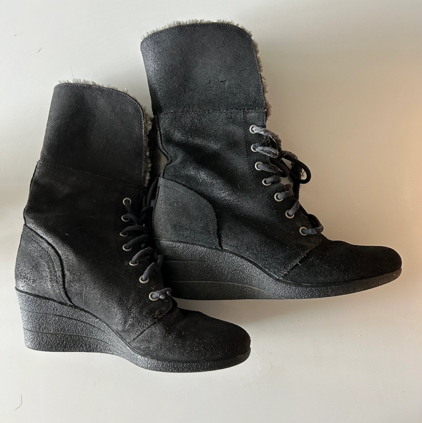 Women's black suede UGG Australia wedge boots. 2.5” heel. Grey sherpa lining.