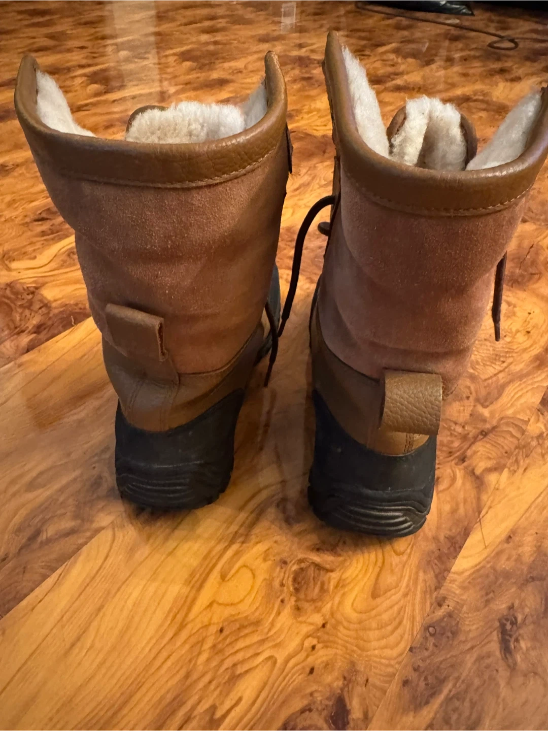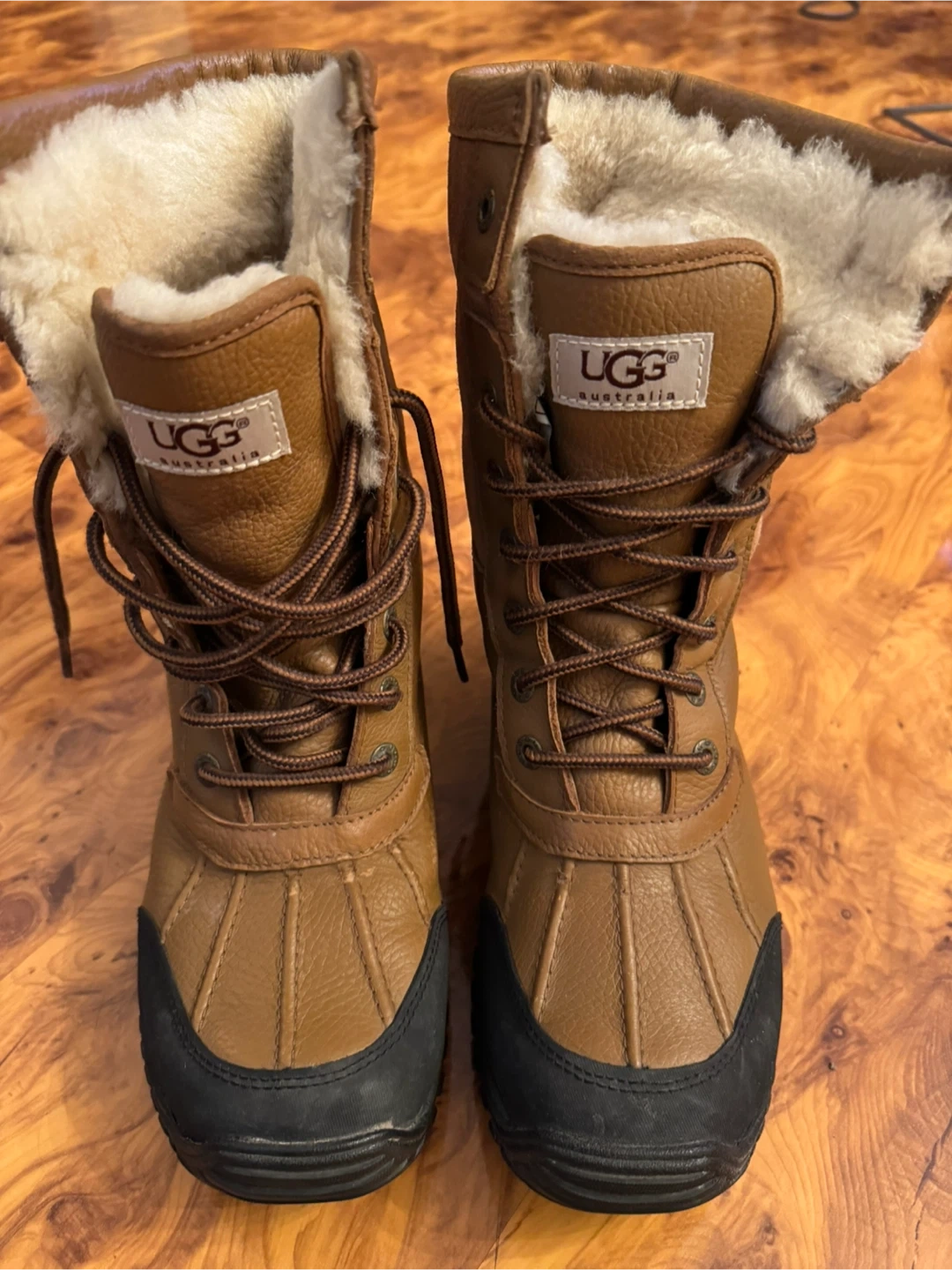 These UGG Australia boots are crafted from durable leather and suede with a warm shearling lining. They feature a Vibram sole for excellent traction and are designed to keep your feet cozy and dry. Perfect for cold weather adventures! Size 8