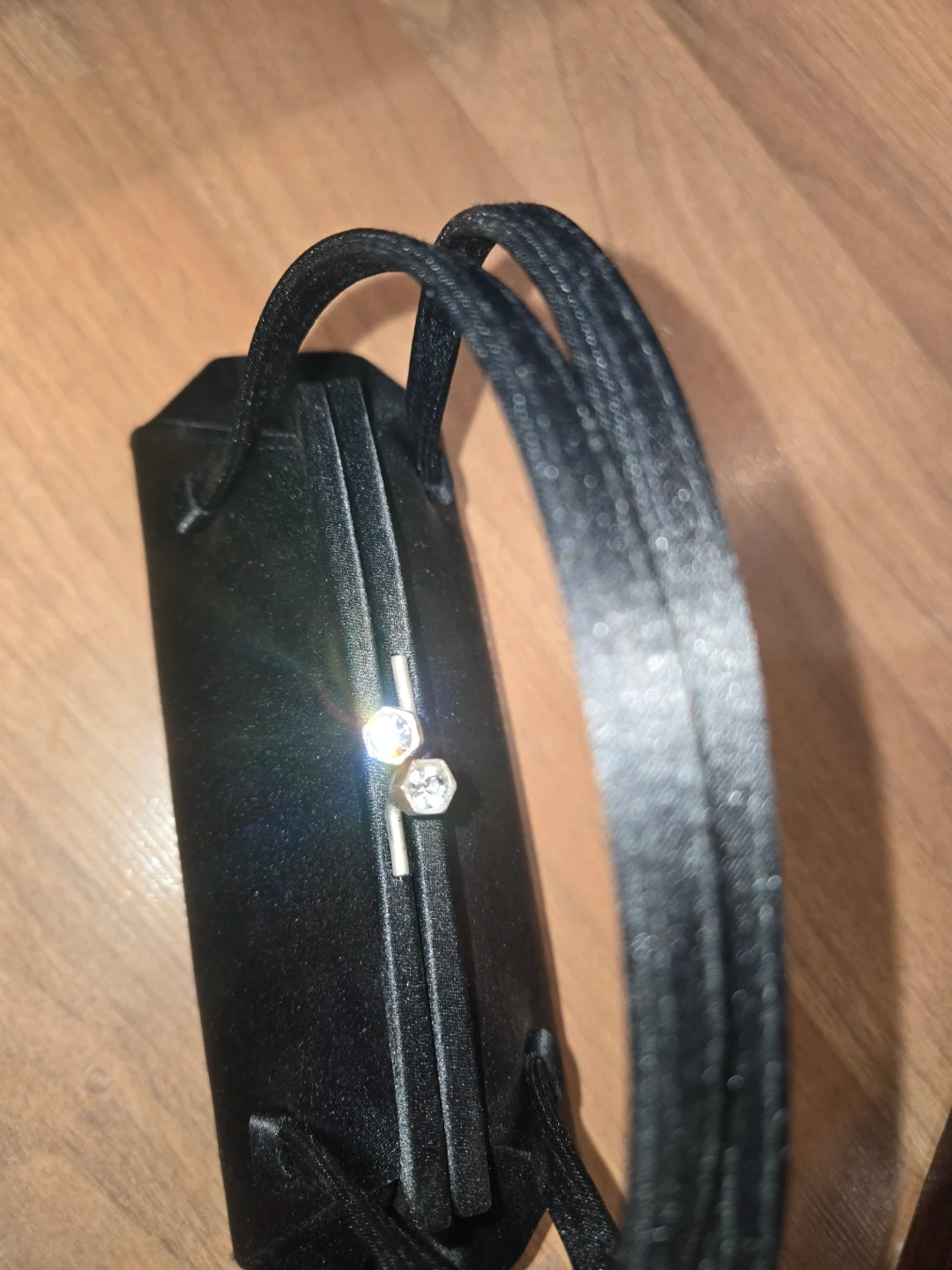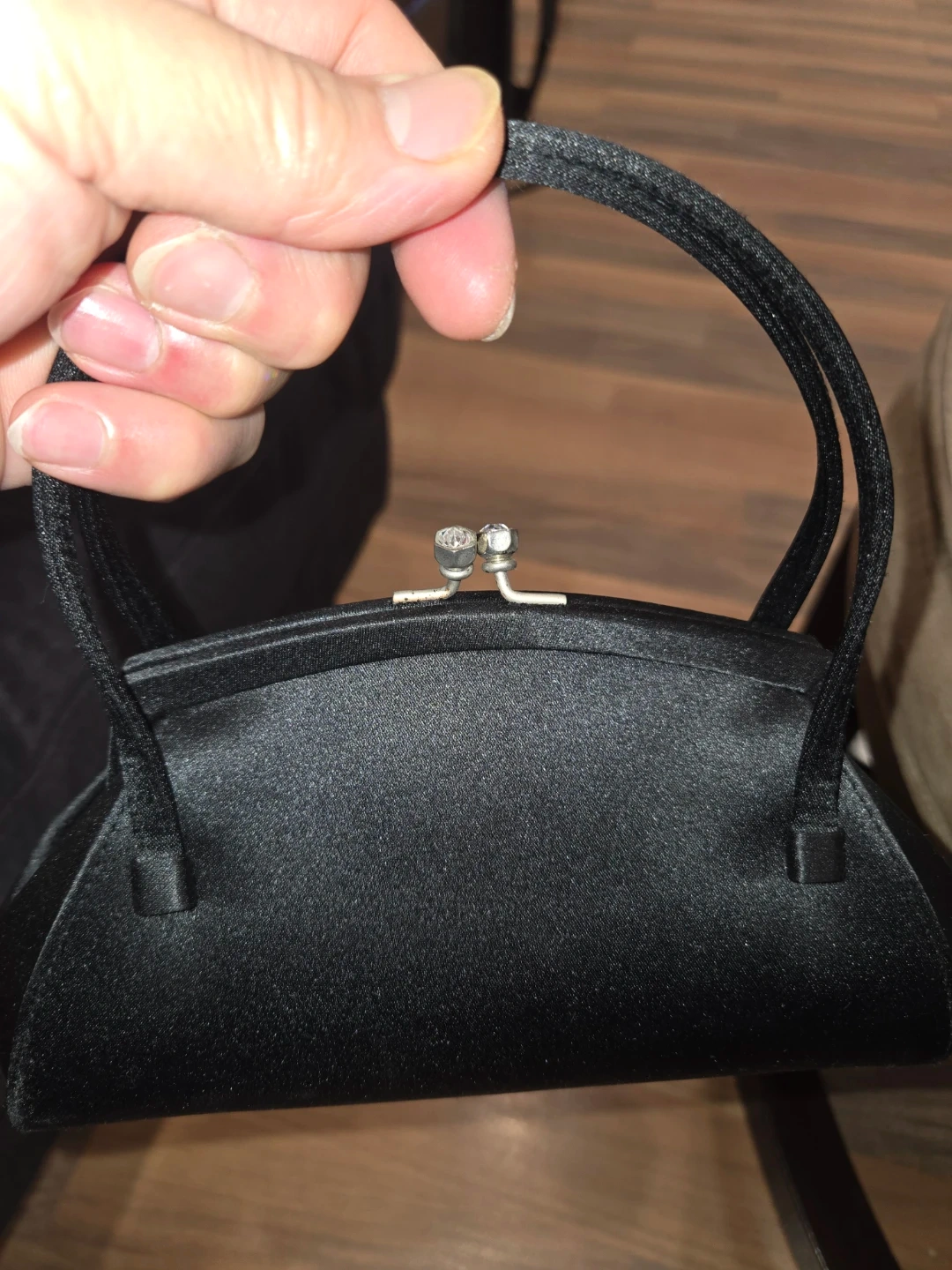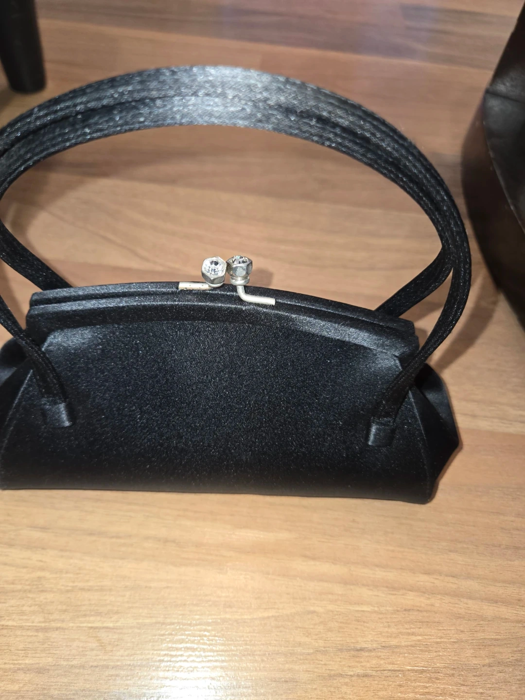 Black satin evening clutch with rhinestone clasp