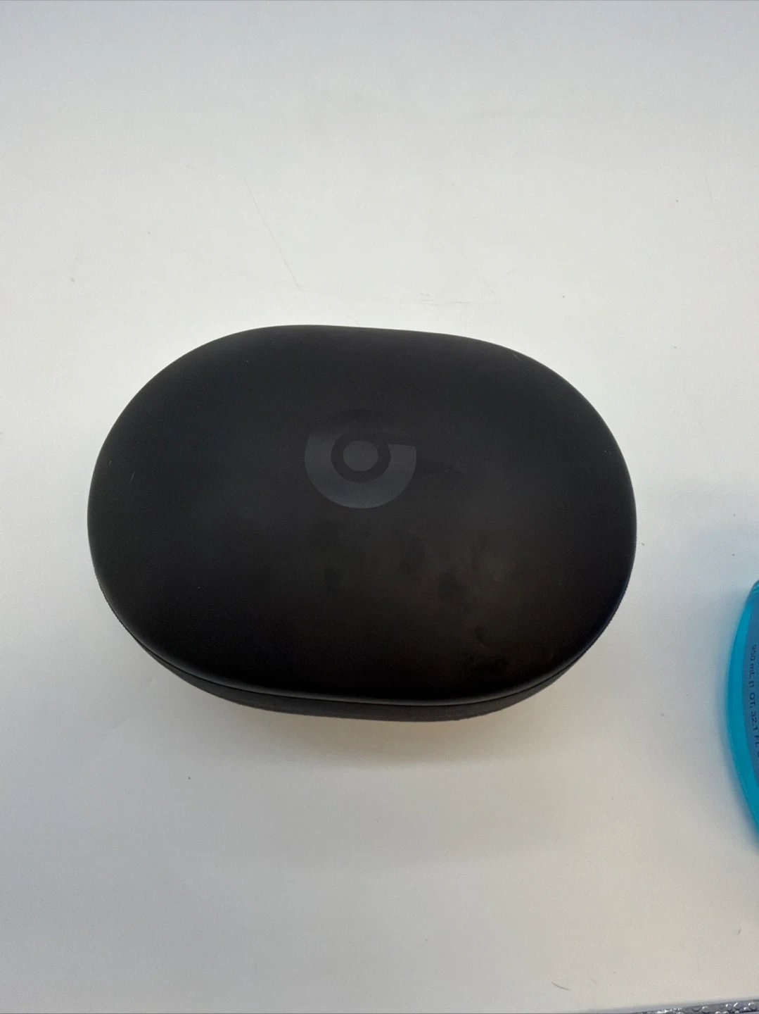 This is a black carrying case for Beats By Dre headphones. It's hard-shelled and oval-shaped, perfect for protecting your headphones. It includes a black audio cable. This case is great for travel or just keeping your headphones tidy!