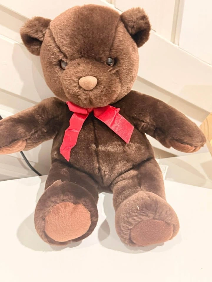 - Brown teddy bear with red ribbon