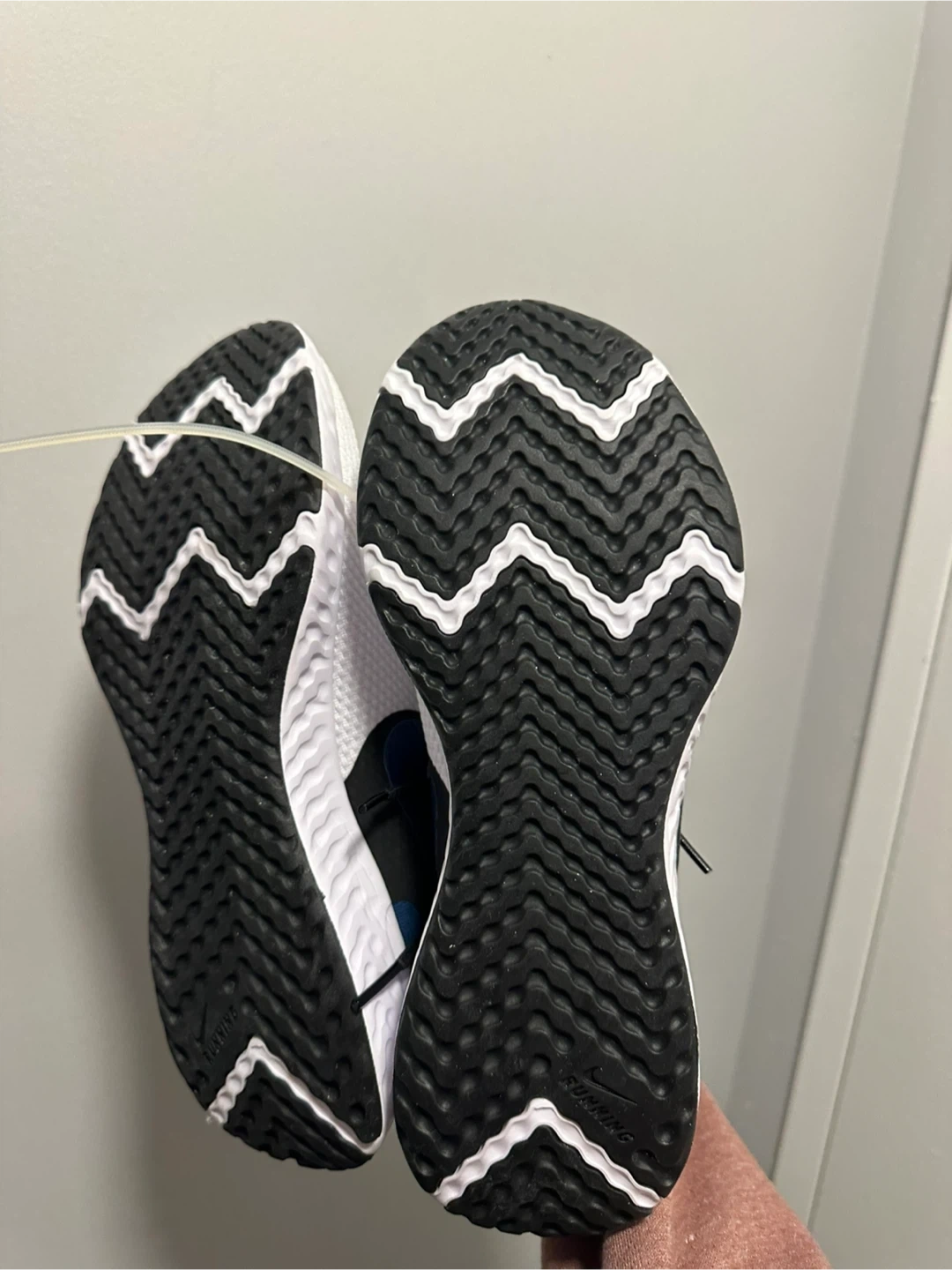Nike running shoes in white, black, and blue. These shoes feature a breathable mesh upper and a durable rubber outsole for traction. Ideal for your daily runs!